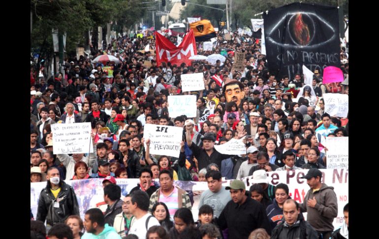 México | Miembros del movimiento realizan evento político cultural frente a Televisa #YoSoy132 marcha desde Tlatelolco Miembros del movimiento realizan evento político cultural frente a Televisa Chapultepec Por: SUN 30 de junio de 2012 - 20:53 hs Integrantes de #YoSoy132 caminaron en dirección a Televisa Chapultepec 'en vela por la democracia'. EL UNIVERSAL / CIUDAD DE MÉXICO (30/JUN/2012).- Integrantes del movimiento #YoSoy132 se congregaron en la Plaza de las Tres Culturas en previsión a la marcha denominada "En vela por la democracia", que culminará en la Plaza de la Constitución. De acuerdo con los participantes, entre quienes están estudiantes de la UNAM, IPN, UAM y la Universidad Autónoma del Estado de México, se esperaba que la marcha tomará Eje Central, Reforma, Balderas, Izazaga y 20 de Noviembre. Se solicitó a los participantes y a la ciudadanía en general que no lleven ningún cartel con consignas partidistas y a quienes los portan les serán canjeados por veladoras, a fin de respetar la llamada "veda electoral". La Secretaría de Seguridad Pública del Distrito Federal (SSPDF) informó que un contingente de más de 10 mil personas marchó por Reforma y tomó rumbo al inmueble de la televisora, en donde haría una pausa con un mitin y caminar por Doctor Río de la Loza para dar vuelta en 20 de Noviembre y enfilarse al Zócalo. Elementos de tránsito de la SSPDF realizaron cortes a la circulación en Hidalgo, Reforma, Bucareli y Chapultepec para permitir el paso de los manifestantes. Previo a la marcha que se tenía contemplada que iniciaría a las 18:00 horas, a la Plaza de las Tres culturas llegó un mariachi y un luchador con la máscara de plata y la leyenda #YoSoy132 en el pecho, quien levantó en sus brazos a una niña de cinco años que portaba una cartulina que decía "gracias por luchar por mi generación". De inmediato los asistentes se sumaron a "Cielito lindo", en medio de un ambiente festivo, luego que la lluvia les dio un respiro. Temas Elecciones México 2012 #YoSoy132 Lee También Día de Muertos 2025: ¿Dónde comprar papel picado en CDMX? México vs Corea del Sur: EN VIVO, dónde ver el partido por el Mundial Sub-17 femenil Desfile de Alebrijes Monumentales, ruta y hora del evento HOY en CDMX Así es como el minimalismo ha impactado en la cultura mexicana Recibe las últimas noticias en tu e-mail Todo lo que necesitas saber para comenzar tu día Registrarse implica aceptar los Términos y Condiciones