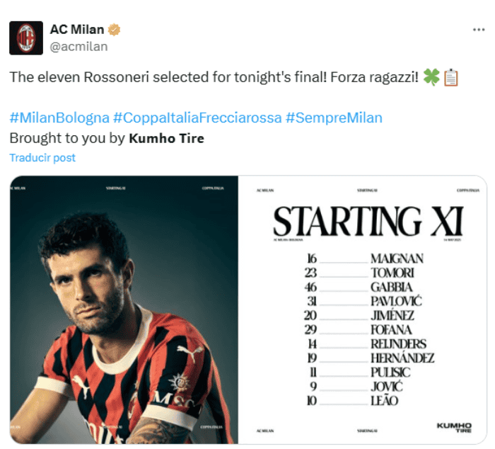 Deportes | Milan vs Bologna EN VIVO: jugadas destacadas de Santiago Gimenez en la final de la Copa Italia Sigue aquí las acciones más relevantes del partido El Informador 14 de mayo de 2025 - 15:00 hs 0 ‒ 1 ¡Bolonia campeón! AC Milan y Santiago Giménez caen y pierden el título de la Copa de Italia. Santi, a la cancha El mexicano Santiago Giménez entra al terreno de juego al minuto 62; reemplaza a Luka Jovic. ¡Gooool! Dan Ndoye abre el marcado de la final al minuto 53; la ventaja es para los visitantes. Inicia el segundo tiempo Arrancan los 45 minutos restantes del encuentro. El partido se mantiene sin goles. Final del primer tiempo El árbitro decreta el final de la primera parte. Los jugadores salen del campo de juego. Inicio del partido Estos son los jugadores con los que los equipos salen al terreno de juego en el Stadio Olimpico de Milan. Temas Futbol Internacional copa de italia Futbol italiano AC Milan bolonia Lee También ¿Dónde ver EN VIVO el partido Tigres vs Toluca? Vucetich renuncia al Mazatlán ¿Dónde ver EN VIVO el partido Cruz Azul vs América? Las frases más icónicas de Pepe Mujica y sus discursos que marcaron la historia