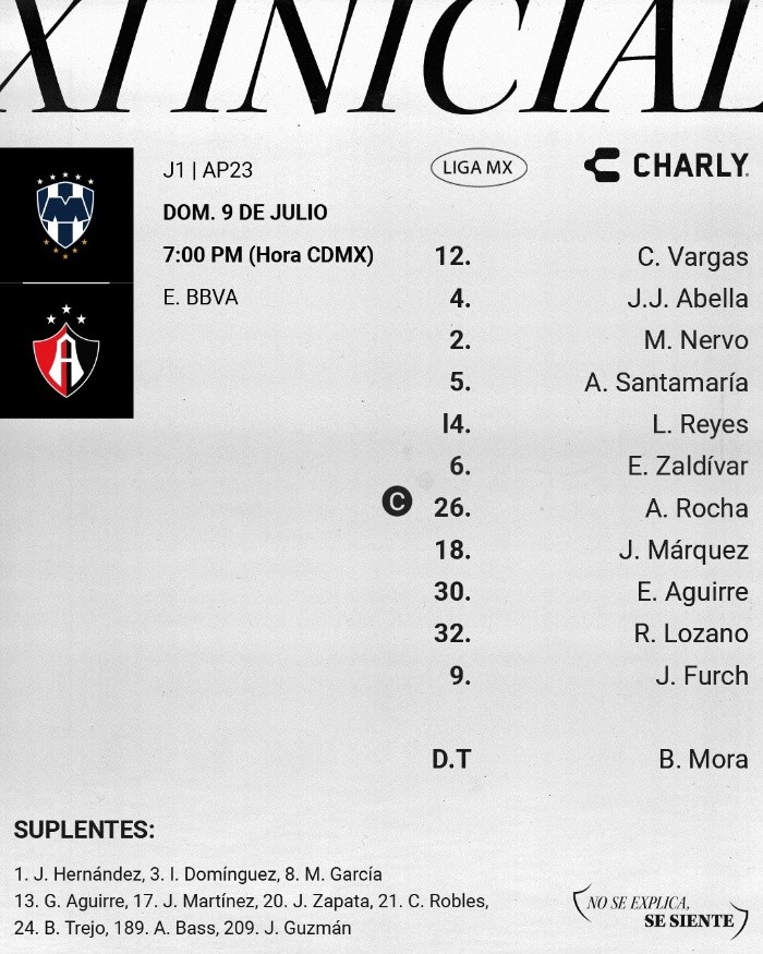 Deportes | Monterrey vs Atlas • Momentos destacados • Jornada 2 • Liga MX Atlas buscará ante Monterrey, y fuera de casa, su segunda victoria del torneo Iván Emmanuel Ortega Herrera 9 de julio de 2023 - 19:00 hs Monterrey1 ‒ 0Atlas Se acabó el partido Atlas cayó por la mínima diferencia ante los Rayados del Monterrey. 90' Se agregan 6 minutos 85' Últimos minutos El tiempo comienza terminarse. Atlas tendrá que arriesgar un poco más para conseguir el empate. 77' Debuta con Atlas Se va Jeremy Márquez y entra el colombiano Juan Manuel Zapata, quien debuta con Atlas. 75' Vive su mejor momento Atlas pasa por un gran momento en el partido. Insiste en querer empatar el partido. 69' Cambio rojinegro Otro cambio en Atlas. Se va el "Mudo" Aguirre y entra Brayan Trejo. 66' Era gol Tiro libre que cobra Santamaría, el disparo pasó a un lado de la defensa regia y el arquero Andrada recuesta y saca el balón a tiro de esquina. 64' Se anima Aguirre El equipo rojinegro intentó tomar mal parado a Monterrey. El "Mudo" Aguirre saca un disparo que pasa muy cerca de la portería regia. 59' Cambios en Atlas Benjamín Mora decide moverle a su once. Se va Édgar Zaldívar y entra Mateo García, además sale Rivaldo Lozano e ingresa Jorge Luis Guzmán. 55' A la defensiva Con línea de cinco, el equipo rojinegro busca combatir el ataque del equipo regio; Atlas insiste en el contragolpe. 50' No aprovecharon Tres tiros de esquina seguidos a favor del Atlas, pero ninguno fue aprovechado para hacerle daño al rival. Comienza el segundo tiempo Atlas va en busca de la remontada. Los mismos 22 jugadores saltan al terreno de juego. Se acabó el primer tiempo Luego de 45 minutos el árbitro decide mandar al descanso a los jugadores. Atlas tendrá mucho por mejorar para la segunda parte. 45' Querían el segundo Maxi Meza saca potente disparo desde fuera del área, y pega en un defensor rojinegro; el balón iba directo a la portería de Camilo Vargas. 37' Sin peligro Aldo Rocha saca un zapatazo con la pierna izquierda que pasa muy pero muy por arriba de la portería de Andrada. 31' Rayados es mejor El equipo local muestra superioridad en el partido y no ha dejado que los rojinegros pasen del medio campo. 24' No encuentran por dónde Luego de la anotación de Monterrey, el equipo tapatío ha perdido la posesión del balón, y no encuentra cómo hacerle daño al rival. 16' Amarilla para Atlas Cartón amarillo para el "Mudo" Aguirre luego de una fuerte entrada en contra de Berterame. 11' GOOOOOL DE MONTERREY Medina, de cabeza, pone adelante en el marcador a los Rayados del Monterrey. 4' Insiste el Zorro Zurdazo de Aldo Rocha que pasa por un lado de la portería del arquero de Monterrey. Los rojinegros quieren el gol lo antes posible. 1' Avisa Atlas Desborda el "Mudo" Aguirre, envía centro a Furch, quien remata de cabeza con fuerza, pero el arquero Andrada estaba bien ubicado. Arranca el partido Monterrey el equipo obligado a ganar; Atlas quiere dar golpe de autoridad fuera de casa ¡Que gane el mejor! Juega limpio, siente tu liga Se lleva a cabo el protocolo de la Liga MX. Ambos equipos ya se encuentran en la cancha. Alineaciones del partido Así jugará esta noche el equipo que dirige el técnico Fernando Ortiz. Estos son los 11 jugadores que manda a la cancha el técnico Benjamín Mora. Temas Atlas Rayados de Monterrey Liga MX Apertura 2023 Lee También ¿Quién ganará el partido entre las América y Chivas? Esto dice la IA Clima en Monterrey hoy: el pronóstico para el sábado 11 de octubre de 2025 Proyectan expansión de Placencia Muebles Chivas Femenil, a una victoria de asegurar su lugar en Liguilla