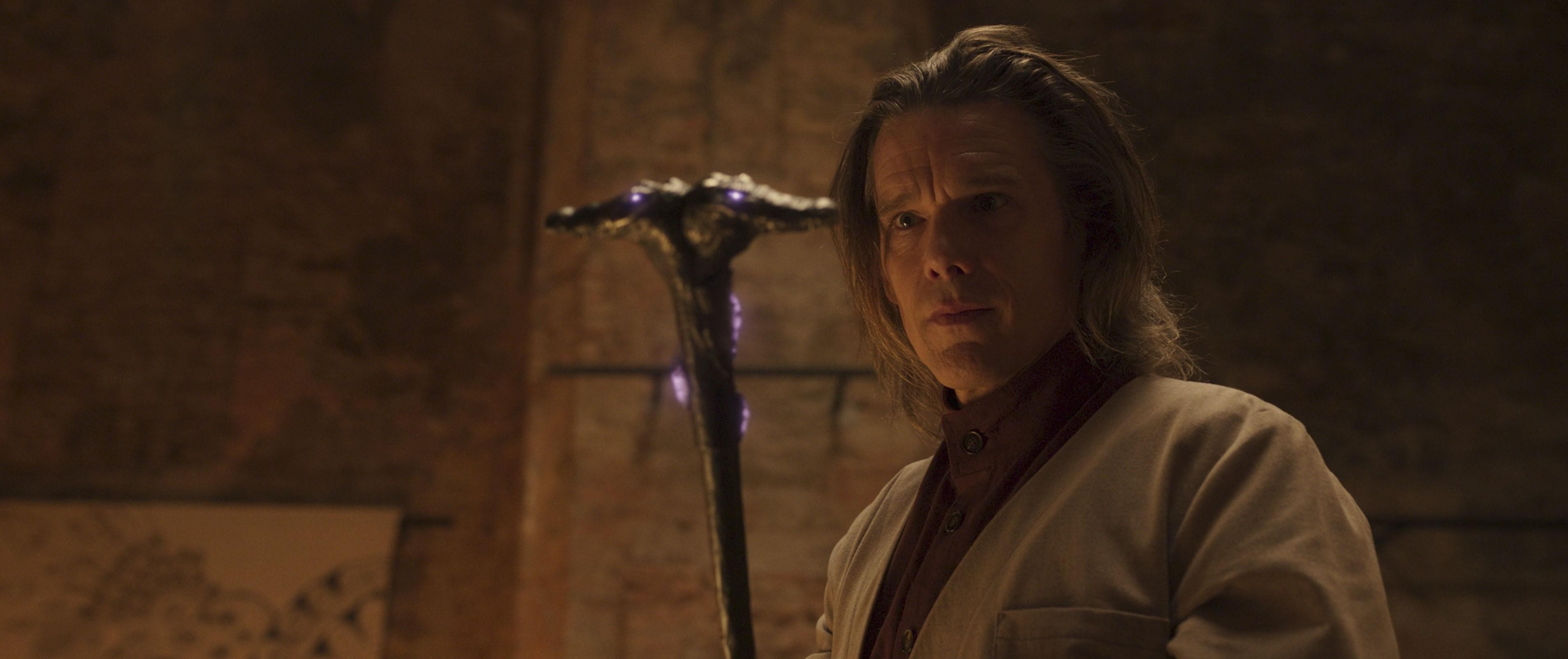 La vestimenta de Arthur Harrow, que se asemeja a la de un monje, se completa con dos accesorios reveladores. El personaje lleva dos brazaletes con símbolos artísticos del antiguo Egipto que significan “muerte”.