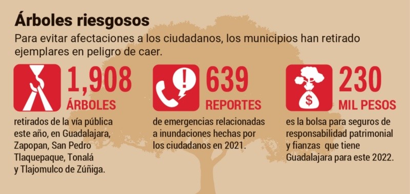 Durante este año, los Ayuntamientos de Guadalajara, Zapopan, San Pedro Tlaquepaque, Tonalá y Tlajomulco de Zúñiga han retirado mil 908 árboles de la vía pública como parte de los derribos precautorios, según reportaron por Transparencia.En el caso de Zapopan, además contrató a una empresa para el derribo de árboles, mantenimiento de áreas verdes y servicio de suministro de plantas de ornato, con un costo de 13.3 millones de pesos.El proveedor está obligado a retirar 631 árboles de tres metros de altura en adelante, el cual debe incluir destaconado de raíz y recolección de desechos.En las justificaciones del contrato de estos servicios, el municipio menciona que se requiere contratar a una persona especializada para efecto de que preste sus servicios profesionales consistentes en brindar el mantenimiento de áreas verdes y plantas de ornato.“No obstante que no cuenta con los recursos suficientes para incorporar de tiempo completo a expertos profesionistas, a su cuerpo de servidores públicos, puede aún satisfacer los objetivos a que se refiere el inciso anterior, mediante la contratación de servicios externos independientes de apoyo, con el nivel y especificaciones profesionales requeridos”.El Ayuntamiento tapatío no informó si tiene contratado algún servicio similar. Por Transparencia, la Dirección de Parques y Jardines respondió que no cuenta con esa información, ya que no es de su competencia.Los Ayuntamientos de San Pedro Tlaquepaque, Tonalá y Tlajomulco de Zúñiga respondieron que los trabajos los desarrollan Parques y Jardines y Áreas Verdes, por lo que no se tiene concesionado el servicio.Los municipios informaron que el retiro de los ejemplares se programa según sea el caso de situaciones de riesgo. Durante la lluvia registrada el pasado 13 de junio en la Zona Metropolitana de Guadalajara, un árbol cayó sobre una joven. La mujer de alrededor de 20 años resultó con lesiones en la cadera, luego de que el arbusto se volteara desde la raíz. Los hechos ocurrieron en los cruces de las calles Cuauhtémoc y Analco, en la colonia Analco, según la Unidad de Bomberos de Guadalajara. Los árboles caídos durante la temporada de lluvias van en aumento en los municipios de la metrópoli. Durante el año pasado se vinieron abajo mil 707 ante las tormentas, una cifra superior a los mil 362 del temporal del 2020, de acuerdo con datos de los Ayuntamientos. El municipio tapatío es el que más árboles caídos reporta, con 911 durante el año pasado. Las zonas más afectadas o con mayor riesgo son: Olímpica, Cruz del Sur, Oblatos, Minerva y Centro. Tan sólo en las lluvias de junio pasado en la ciudad, las autoridades de Guadalajara, Zapopan, Tlaquepaque, Tonalá y Tlajomulco documentan 386 ejemplares que se han caído por las tormentas o por fuertes vientos. La lluvia de ayer dejó varios árboles caídos e inundaciones en varios puntos de la ciudad, principalmente en el Oriente. Se suspendió el servicio del Macrobús y Línea 3 del Tren Ligero por quince minutos. El presupuesto para indemnizar a las personas que sufrieron algún daño en sus bienes, atribuidos a omisiones del Ayuntamiento, se redujo este año en Guadalajara. La bolsa para la partida de seguros de responsabilidad patrimonial y fianzas pasó de 285 mil pesos durante el año pasado, a 230 mil pesos en el actual. Lo anterior, según los recursos etiquetados en el presupuesto municipal, en el cual se deben considerar estos seguros, de acuerdo con lo establecido en la Ley de Responsabilidad Patrimonial del Estado de Jalisco y sus Municipios.Los principales reclamos de la ciudadanía están relacionados a daños de sus vehículos por baches y caída de árboles.En el caso de Zapopan, la bolsa sí presentó un alza de 10 mil pesos. Al pasar de 70 mil pesos durante el año pasado a 80 mil pesos en el ejercicio actual.En la ley estatal se reconoce el derecho a la indemnización a quienes sufran daños en cualquiera de sus bienes o derechos como consecuencia de la actividad administrativa irregular de los Poderes del Estado, sus dependencias y organismos públicos descentralizados.En ésta se destaca que los montos de las partidas presupuestales deben considerar también las indemnizaciones que no hayan podido ser pagadas en el ejercicio inmediato anterior.En el año 2021, este medio reportó que durante la pasada administración (con corte a junio pasado), el Gobierno de Zapopan pagó 273 mil 860 pesos a los ciudadanos por este tipo de daños, una suma tres veces mayor con respecto a los pagos emitidos en Guadalajara: 76 mil 627 pesos.El municipio de Zapopan reportó que hasta esa fecha se habían iniciado más de 200 trámites por responsabilidad patrimonial, en los cuales se reclamaban más de 322 mil pesos y sólo el 40% había sido procedente. De acuerdo con lo establecido en la Ley de Responsabilidad Patrimonial del Estado de Jalisco y sus Municipios, las reclamaciones de indemnización deberán presentarse por escrito, debiendo contener como mínimo: La entidad a la que se dirige.El nombre, denominación o razón social del promovente y, en su caso, del representante legal, agregándole los documentos que acrediten la personería, así como la designación de la persona o personas autorizadas para oír y recibir notificaciones y documentos.El domicilio para recibir notificaciones.En la petición que se formula, se agrega un cálculo estimado del daño generado.La descripción cronológica y clara de los hechos, y razones en los que se apoye la petición.La relación de causalidad entre el daño producido y la actividad administrativa irregular de la entidad.Las pruebas, cuando sean necesarias, para acreditar los hechos argumentados y la naturaleza del acto que así lo exija.Nombre y domicilio de terceros en el caso de existir. El lugar, la fecha y la firma del interesado o, en su caso, la de su representante legal. La lluvia de ayer en la Zona Metropolitana de Guadalajara dejó, al menos, 13 ár