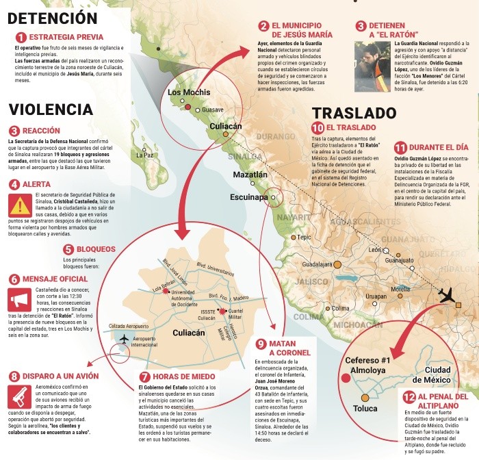 Autoridades federales detuvieron ayer a Ovidio Guzmán, hijo de Joaquín “El Chapo” Guzmán, durante un operativo en Culiacán, Sinaloa, lo que desató intensos tiroteos y quema de vehículos en esa Entidad, con saldo de un muerto y 28 heridos.Guzmán, apodado “El Ratón”, fue capturado por el Ejército y la Guardia Nacional. Es acusado de liderar la fracción “Los Menores”, afín al cártel de Sinaloa. El arresto se produjo tres días antes de la llegada a México del presidente estadounidense, Joe Biden, cuyo país ofrecía cinco millones de dólares (MDD) por la captura de Ovidio, quien fue trasladado a Ciudad de México en un avión de la Fuerza Aérea.El canciller Marcelo Ebrard descartó una extradición “exprés” y negó que la aprehensión sea para congraciarse con Biden. La detención de “El Ratón”, de 32 años, desató intensos tiroteos entre criminales y fuerzas de seguridad. La violencia se extendió al aeropuerto internacional de Culiacán, donde un avión de pasajeros recibió un impacto de bala momentos antes de despegar, al igual que una aeronave de la Fuerza Aérea. Videos en redes sociales mostraron a los pasajeros acurrucados para protegerse de las balas, lo mismo que a trabajadores aeroportuarios resguardándose en los mostradores.Las operaciones en la terminal aérea fueron detenidas, provocando suspensiones de vuelos en varios aeropuertos, en tanto se reportaron saqueos en algunos barrios del municipio sinaloense. A raíz de la escalada violenta, las autoridades suspendieron las clases en instituciones educativas, un partido de la liga profesional de futbol y otro de beisbol.Ovidio ya había sido detenido el 17 de octubre de 2019 en Culiacán, pero fue liberado por orden de Andrés Manuel López Obrador (AMLO) en medio de un ataque de la organización criminal.1 agente de la Guardia Nacional muerto y 28 personas heridas, entre ellos 25 agentes y tres civiles que transitaban por los enfrentamientos, informó el gobernador de Sinaloa, Rubén Rocha Moya.19 bloqueos en calles y enfrentamientos, en algunos casos con vehículos incendiados; se registraron 200 vehículos robados y también hubo rapiña y saqueos, en por lo menos 20 casos. 12 horas aproximadamente duró la violencia en Culiacán; entre los ataques, destacando los disparos contra un avión de pasajeros en el Aeropuerto de esa ciudad.2021. Los gobiernos de Biden y López Obrador dieron un giro a su cooperación antidrogas para enfocarse en atacar la pobreza como causa del narcotráfico, tras 15 años de una “estrategia militar fallida”.5 millones de dólares ofreció Washington en diciembre de 2021 por información que conduzca al arresto o condena de Ovidio, además de sus hermanos Archivaldo, Jesús Alfredo y Joaquín.Durante la madrugada de ayer se reportó la recaptura de Ovidio Guzmán alias “El Ratón”; durante la detención algunos comandos delincuenciales ingresaron al Aeropuerto Internacional de Culiacán, en donde atacaron a un avión de la Sedena y un avión comercial de Aeroméxico. Horas después el reporte fue confirmado: Guzmán López ya se encontraba detenido en la Ciudad de México.“El Ratón” fue trasladado de Sinaloa a la Ciudad de México al Centro Federal de Readaptación Social número 1, “Altiplano” en el municipio de Almoloya de Juárez, Estado de México.Así es el penal del AltiplanoEl “Penal de Almoloya” se construyó en los años 1988 y 1990 durante la gestión de Carlos Salinas de Gortari, las medidas de seguridad estuvieron a cargo de la Asociación de Correccionales de Estados Unidos, pero hasta noviembre de 1991 recibió a sus primeros reclusos.La considerada prisión de máxima seguridad pertenece al Órgano Administrativo Desconcentrado, Prevención y Readaptación Social de la Comisión Nacional de Seguridad, la cual cuenta con sensores de movimiento, control de accesos, detectores de droga, explosivos, metal y alarmas.¿Cómo está construido?Es la prisión con mayor seguridad en el país debido a que cuenta con paredes de un metro de espesor, sensores de movimiento y el espacio aéreo se encuentra restringido, así como la comunicación en 10 kilómetros a la redonda.Cuenta con una superficie de 260 mil metros cuadrados, así como sistemas, equipos electrónicos y electromecánicos de seguridad como circuitos cerrados de televisión, radiocomunicación y telefonía, además cuenta con la capacidad para 836 prisioneros, inicialmente fue de 724.En 2017 consiguió la certificación por la Asociación Norteamericana de Correccionales mediante la embajada de Estados Unidos al cumplir los estándares mundiales de gestión y seguridad.¿Dónde está ubicado? Su ubicación exacta es a unos 25 kilómetros de Toluca, en el Exrancho La palma S/N, poblado de Santa Juana, en el municipio de Almoloya de Juárez, Estado de México. El inmueble alberga acusados por homicidio, portación de arma, tortura, delincuencia organizada, clonación de tarjetas, por mencionar algunos.PERFILLA VOZ DEL EXPERTOÉdgar Ortiz Arellano, especialista en seguridad y académico de la UNAM.La recaptura de Ovidio Guzmán, hijo del “Chapo” Guzmán, ocurrida ayer en Sinaloa, acallará los rumores en torno a que el actual Gobierno mantiene un pacto con líderes de cárteles de las drogas, asegura el especialista en seguridad y académico de la Universidad Nacional Autónoma de México (UNAM), Édgar Ortiz Arellano.Reconoce que la recaptura de Ovidio es un acierto para el Gobierno que encabeza el Presidente Andrés Manuel López Obrador, aunque asegura que este golpe al cártel de Sinaloa se inserta en una estrategia mediática que incide con la X Cumbre de Líderes de América del Norte y con las elecciones que se realizarán este año en Coahuila y el Estado de México.“En política no existen las casualidades y ese hecho se inserta en la reunión de López Obrador con sus homólogos de Estados Unidos, Joe Biden, y el primer ministro de Canadá, Justin Trudeau, y l
