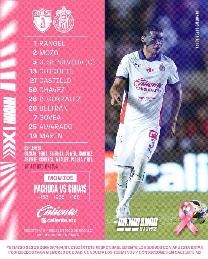 Deportes | Pachuca vs Chivas • Momentos Destacados • Jornada 12 • Apertura 2024 Las Chivas visitarán el Estadio Hidalgo para enfrentar a los Tuzos del Pachuca como parte de la J12 del Apertura 2024 Sergio Alejandro Velázquez 19 de octubre de 2024 - 16:00 hs PACHUCA0 ‒ 2CHIVAS Fin del partido 90+2' Amarilla para Chivas Fernando González recibe una amonestación más para el Rebaño. 90' Agregan 8 minutos al segundo tiempo 85' Chivas hace más movimientos Salen: Roberto Alvarado y Fernando Beltrán. Entran: Yael Padilla y Carlos Cisneros. 81' Otra amarilla para Chivas Mateo Chávez recibe la segunda amonestación para el conjunto rojiblanco. 73' Pachuca realiza cambios Salen Bryan González y Luis Rodríguez para dejar entrar a Sergio de los Ríos y Carlos Sánchez. 67' "Tiba" Sepúlveda sale lesionado del campo Gilberto Sepúlveda sale del campo debido a una lesión, Luis Rey ingresa en su lugar. 65' Chivas hace modificaciones y Cowell regresa con Chivas Salen: Ricardo Marín y Omar Govea. Entran: Cade Cowell y Víctor Guzmán. 63' Amonestación para el Pachuca Salomón Rondón recibe la primera tarjeta amarilla de los Tuzos. 55' Los Tuzos presionan en el área del Rebaño Pachuca ha insistido desde el inicio del segundo tiempo cerca del área de Chivas, pero a pesar de algunas buenas oportunidades que han generado, no logran conseguir su primer tanto. Comienza el segundo tiempo Pachuca regresa al campo con modificaciones; salen Owen González y Sergio Hernández para dejar entrar a Faber Gil y Ángel Mena. Fin del primer tiempo 45' Se agregan 3 minutos al primer tiempo 45' Primera amarilla del partido para Chivas Gilberto Sepúlveda recibe la primera amonestación del encuentro por una falta sobre Salomón Rondón. 41' ¡Gooooooooooooooooool de Chivas! Con servicio de Roberto Alvarado, Gilberto Sepúlveda aparece para rematar el balón y hacer más grande la ventaja para el Rebaño. ¡Vean qué pase puso el Piojo y cómo no perdonó Sepúlveda!⚪ Ojito que aquí les traemos el segundo gol del Rebaño de esta tarde.@Tuzos 0-2 @Chivas pic.twitter.com/G27qcN2DNE — Liga BBVA MX (@LigaBBVAMX) October 19, 2024 27' Pachuca insiste por el empate Los Tuzos suman minutos intentando igualar el marcador, sin embargo, la defensa de Chivas obstaculiza las intenciones del equipo local. 20' ¡Gooooooooooooooooool de Chivas! Roberto Alvarado lleva el balón hacia el arco del Pachuca por medio de un remate de cabeza. ¡Qué definición! Etiqueten a su Chivahermano favorito para que vea el pase del 4K y el remate del Piojo Alvarado.@Tuzos 0-1 @Chivas https://t.co/QukfzlkxwF pic.twitter.com/x7uGGqYNhf — Liga BBVA MX (@LigaBBVAMX) October 19, 2024 11' Rondón amenaza la portería del "Tala" Salomón Rondón realiza el primer tiro de riesgo en lo que va del partido, sin embargo, el balón termina a un costado del travesaño de Chivas. 5' Se disputa la posesión en el arranque del partido El encuentro arranca con un constante intercambio del balón, Pachuca acumula más momentos intentando generar una jugada de ataque, mientras que el Rebaño insiste en el medio campo por encontrar un espacio para avanzar. Comienza el partido El balón comienza a rodar para dar inicio al partido dentro de la cancha del Estadio Hidalgo Alineación de Pachuca Alineación de Chivas Mantente al día con las noticias, únete a nuestro canal de WhatsApp SV Temas Chivas Tuzos de Pachuca Liga MX Futbol Mexicano apertura 2024 Torneo Apertura 2024 Lee También 'Chucky' Lozano hace ilusionar a Chivas con una declaración sobre su futuro Dólar sube ante tensiones comerciales y preocupaciones fiscales Chivas Femenil, a una victoria de asegurar su lugar en Liguilla México busca frenar el paso perfecto de Argentina en Mundial Sub-20