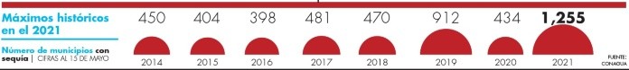 Las lluvias registradas en la primera quincena de mayo ayudaron a que algunas zonas de país salieran de la sequía en la que se encontraban, sin embargo, existieron otras entidades en territorio mexicano que su situación no cambió, inclusive su panorama empeoró.Según el último reporte del Monitor de Sequía de México, elaborado por la Comisión Nacional del Agua (Conagua) durante la última quincena de mayo, el porcentaje de área con sequía de moderada a excepcional (D1 a D4) a nivel nacional fue de 75.63%, ligeramente mayor (0.36%) que lo cuantificado al 30 de abril pasado, cuando se registró 75.27 por ciento.De igual modo, se detalló en el informe que de los 32 estados de la República, 16 entidades registraron 100% de sus municipios con algún tipo de sequía.El informe también detalló que las regiones en donde se incrementaron las condiciones de sequía en nuestro país fueron: la península de Baja California, Sonora, Chihuahua, Coahuila, Sinaloa, Durango, Nayarit, Colima y Quintana Roo. El motivo fue que se recibieron escasas o nulas precipitaciones. En esas entidades, con excepción del estado de Quintana Roo, aumentaron las áreas con sequía severa o extrema (D2 o D3).Para el caso de Baja California Sur, el incremento lo tuvo en la categoría de sequía severa (D2) ya que pasó de 31.5% del territorio en esa condición, a finales de abril, a 37.6% al 15 de mayo. En Baja California el aumento también se vio reflejado en la misma escala de 4.7 a 19.1 por ciento.Asimismo, otro estado que tuvo incremento en la categoría D2 fue Nayarit, al 30 de abril registró 81.5% del total de su territorio y para el 15 de mayo el dato fue 99 por ciento.En lo que respecta a la categoría de sequía extrema (D3) varios estados tuvieron incrementos; resalta el caso de Colima que pasó de 0 a 40.3%, y Sinaloa, que registró en el reporte de abril 35%, mientras que para el último informe de la dependencia la cifra fue de 53.8 por ciento.En el caso de Chihuahua, los dos indicadores tuvieron un incremento significativo. En la categoría D2 pasó de 56.2 a 60.8%, mientras que en D3 fue de 14.2% a 15.6% del territorio de la entidad que registró dicha magnitud de sequía.Cifras al alzaEn los últimos años las condiciones de sequía en el país han aumentado.De acuerdo con los registros de la Conagua, de los 2 mil 469 municipios con registro en México, mil 255 se presentaban, al 15 de mayo pasado, algún grado de sequía.En comparación, a la misma fecha, pero del 2014, la cifra de localidades sólo era de 450 que registraban algún grado de sequía.En la actualidad, el documento de la Conagua señaló que la entidad con mayor número de ayuntamientos con sequía es Jalisco con un total de 125, le sigue Michoacán con 113 y en tercer lugar Oaxaca con 98. Lo anterior significa que estas entidades, junto a Durango, pasan por algún tipo de sequía en todos sus municipios.Caso contrario se puede observar en los casos de Campeche y Tabasco, en ambas entidades, según la Conagua, 100% de sus municipios están sin afectación, además de Yucatán con 88% de sus municipios sin afectaciones y Chiapas con 87.8 por ciento.Zonas con reducción“En la primera quincena de mayo del 2021, se tuvo un inicio benéfico para la temporada de lluvias.“Las lluvias de esa quincena se distribuyeron sobre el noreste, oriente, centro, sur y sureste del país, y se asociaron principalmente al paso de la décimo cuarta tormenta invernal, los frentes fríos 54, 55 y 56 (de la temporada 2020-2021), así como al desarrollo de líneas de vaguada y el desarrollo de la tormenta tropical Andrés (la tormenta con nombre más tempranamente registrada en el Océano Pacífico Nororiental, desde 1949)”, se lee en el informe de la Comisión Nacional del Agua.Como consecuencia de lo anterior, hubo una reducción en las áreas, que considera la Conagua con sequía moderada (D1) en diferentes estados de México.El informe también detalló que la sequía de severa a extrema disminuyó ligeramente en algunas entidades del norte del país como Nuevo León, Zacatecas, Guanajuato, el norte de Michoacán y Guerrero.Ante la grave sequía que atraviesa el país, expertos coincidieron que se deben destinar más recursos a los programas de prevención, sin descuidar lo erogado a la atención de las emergencias de esta índole.México vivió del 2010 al 2012 un periodo generalizado de sequía. Un año después se creó el Programa Nacional contra la Sequía (Pronacose).Judith Domínguez, profesora investigadora del Colegio de México, indicó que además del Pronacose, el país cuenta con instrumentos financieros, de información, de gestión y coordinación contra la sequía.“Se creó el Fondo para la Atención de Emergencias (Fonden), que era un instrumento financiero, un fideicomiso. Ahora no sabemos qué es, porque desapareció, sin embargo, existe un presupuesto asignado bajo ese nombre por mucho dinero, más de 8 mil 700 millones de pesos”, indicó la también coordinadora del observatorio de seguridad hídrica del Colmex.No obstante, Domínguez añadió que los instrumentos actuales para contrarrestar la sequía en el país son insuficientes.“Sobre todo por las reducciones presupuestarias, la desaparición de fideicomisos, con la incertidumbre sobre cuáles son las reglas para pedir dinero, tengo información que en Sinaloa ya habían comenzado a pedir dinero desde diciembre y hasta ahora no había llegado nada de apoyo”, dijo.Por su parte, Víctor Orlando Magaña Rueda, investigador del Instituto de Geografía de la UNAM opinó que, para mitigar el impacto de las sequías, se necesita de la participación del gobierno y de la sociedad en general.“Cada vez que ocurre una sequía es que nos vuelven a decir que ahorremos agua, pero en cuanto se acaba no hacemos nada. El mejor momento para actuar frente a una sequía es cuando no la hay”, manifestó Magaña Rueda.Alertan por Cutzamala A su vez, Juan Francisco Bustamante 