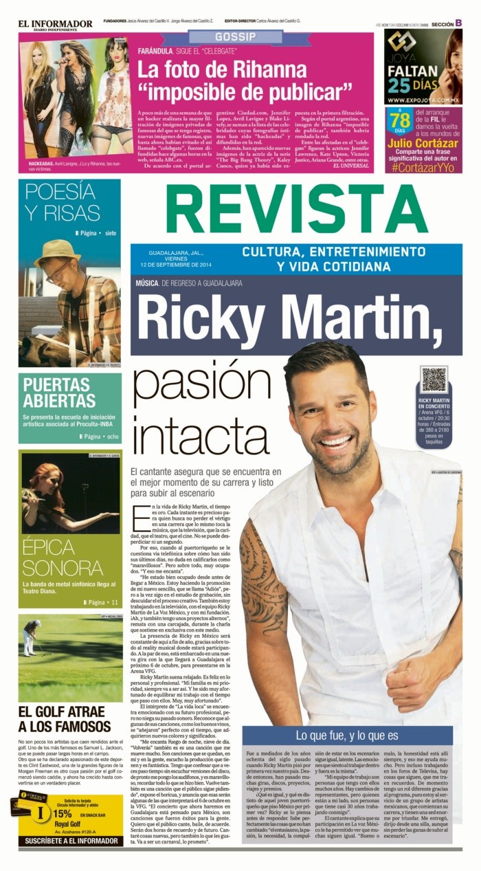 A lo largo de su historia centenaria, EL INFORMADOR ha construido una memoria cultural que no se limita a la política o la vida social, sino que abraza también el espectáculo, reflejando las transformaciones del entretenimiento en México y en el mundo. Sus portadas dedicadas a la música, el cine y la televisión han marcado generaciones de lectores, convirtiéndose en un espejo de cómo cambia la relación entre artistas y audiencias. Entre los titulares que dejaron huella, destaca “¡Te hará SUDAR! Enrique Iglesias”, con la que el medio anunció la llegada del cantante español a Guadalajara en plena efervescencia de su carrera internacional, transmitiendo la energía vibrante de los conciertos que convertían a la ciudad en una parada obligada para figuras globales.Años más tarde, nuevas generaciones encontraron su reflejo en portadas como “Danna Paola le saca provecho a su Mala fama”, publicada en 2019, que relataba cómo la intérprete mexicana transformó críticas en un éxito musical, mostrando el poder de la industria digital y las redes sociales para redefinir la relación entre público y artistas. También brillaron portadas dedicadas a Sebastián Yatra, “la voz más latina”, celebrando el ascenso del colombiano como referente del pop y la música urbana, y subrayando a Guadalajara como plaza clave para los artistas internacionales de habla hispana.La sección ha apostado además por el cruce entre música, moda y cine, con portadas que se volvieron íconos de su época. Una de las más recordadas fue “Belinda se viste de imperio y canta con Jared Leto”, donde la cantante mexicana compartió escenario con el actor y vocalista de 30 Seconds to Mars, vestida con atuendos imperiales que se convirtieron en símbolo de una época en que las colaboraciones internacionales marcaban tendencias. En el ámbito cinematográfico, titulares como “Chicuarotes, una radiografía de la juventud sin esperanza” fueron mucho más que reseñas: ofrecieron una mirada crítica a la realidad de la juventud mexicana, demostrando la capacidad del suplemento de combinar entretenimiento con reflexión social. Entrevistas exclusivas como “Jason Momoa en el trono de Aquaman”, realizada en Nueva York, acercaron al público tapatío al actor que redefinió a uno de los superhéroes más icónicos de DC Comics, mientras que otras portadas destacaron la vocación cinematográfica del suplemento: “El origen de Spider-Man y otras confesiones de Stan” permitió a los lectores compartir recuerdos íntimos de Stan Lee, leyenda de Marvel; “¡Puro acero! Superman renace” exploró el regreso del Hombre de Acero y su vigencia como mito de la cultura pop; y “Willem Dafoe, un punch al cine y a la vida” reveló la visión del actor sobre su oficio y legado, combinando introspección artística con vitalidad personal.A través de estas historias, esta casa editorial ha documentado la evolución del espectáculo, conectando generaciones y transformando cada portada en un testimonio de la cultura popular que trasciende el tiempo y los géneros.No todas las portadas se centraron en nombres específicos: algunas apostaron por la fuerza de la metáfora. Tal es el caso de “Un terremoto humano”, que en realidad encabezó una entrevista con Dwayne Johnson, “La Roca”, en el marco del estreno de “La Falla de San Francisco”. El título evocaba tanto la fuerza física y carisma del actor como la trama del filme centrado en catástrofes naturales.Igualmente, titulares como “Cuando estamos enamorados hacemos cosas insensatas”: Lady Gaga mostraron el estilo directo del suplemento, recogiendo frases memorables de los artistas para convertirlas en portadas que atrapaban a los lectores, en este caso resaltando la visión de Gaga sobre el amor y la vida artística.Cabe señalar que la sección no ha dejado de lado a los íconos de la música latina. La portada “Ricky Martin, pasión intacta” retrató el regreso del boricua a los escenarios, subrayando la energía y autenticidad que, tras décadas de carrera, seguían conquistando al público. Estas notas demostraban cómo el suplemento funcionaba no solo como agenda cultural, sino como crónica de permanencia y renovación en la industria musical.Desde los años ochenta hasta la era digital, las portadas de espectáculos de esta casa editorial han acompañado a los tapatíos en sus experiencias culturales: conciertos masivos, estrenos de cine, lanzamientos musicales y entrevistas con artistas en ascenso. Más que simples titulares, han sido ventanas a los cambios de la industria, los gustos del público y las conversaciones culturales de cada época.Hoy, en un escenario dominado por plataformas digitales y redes sociales, aquellas portadas se mantienen como testimonio histórico de la forma en que Guadalajara ha vivido, celebrado y reflexionado el espectáculo.Recorrer la sección de espectáculos de EL INFORMADOR es adentrarse en décadas de cultura popular a través de la mirada de Guadalajara. No se trata únicamente de reseñar conciertos, películas o artistas de moda; sus páginas han logrado equilibrar lo local y lo internacional, lo frívolo y lo reflexivo, la farándula y la crítica cultural. La riqueza de esta cobertura reside en su diversidad: la música se vive desde los conciertos que hicieron vibrar a la ciudad, de Maluma a Shakira, hasta entrevistas exclusivas que revelan la conexión íntima entre artistas y público. En el cine, portadas dedicadas a producciones nacionales y extranjeras muestran que la narrativa cinematográfica va mucho más allá de la reseña, permitiendo asomarse a la voz y la visión de sus protagonistas. Televisión, cultura pop y fenómenos de la pantalla mexicana retratan series y personajes que marcaron generaciones, configurando un mapa vivo de nuestra memoria colectiva.El estilo editorial de la sección ha dejado una marca distintiva: titulares impactantes como “¡Puro acero! Super