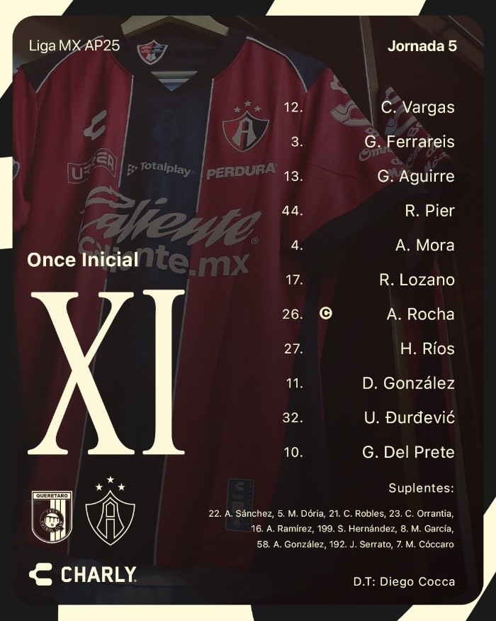 Deportes | Querétaro vs Atlas • Momentos Destacados • Jornada 5 • Apertura 2025 Querétaro y Atlas se enfrentarán en la cancha del Estadio Corregidora, ambos urgidos de puntos en el certamen Sergio Alejandro Velázquez 17 de agosto de 2025 - 15:30 hs QUERÉTARO3 ‒ 3ATLAS Fin del partido Querétaro y Atlas empataron 3-3 en un partido vibrante. Atlas se adelantó temprano con un gol de Gustavo Del Prete, pero Pablo Barrera igualó desde el penal al 58. Uros Djurdjevic y Adrián Mora volvieron a poner en ventaja a los visitantes, aunque en los últimos minutos Rodrigo Bogarín y Lucas Rodríguez logró el empate definitivo para los locales, sellando un cierre lleno de emoción y acciones intensas. 90+8 ¡Querétaro empata el partido! Lucas Rodríguez iguala el marcador 3-3 con un remate de izquierda desde el centro del área al centro de la portería, tras una asistencia de Jhojan Julio. 90+5' ¡Gooool de Querétaro! Rodrigo Bogarín consigue el 2-3 con un remate de cabeza a quemarropa junto al poste izquierdo, tras un centro de Pablo Barrera tras ejecutar una falta. 90+2' Otro cambio de los Zorros Sale Gustavo Ferrareis para dejar entrar a Carlos Orrantia. 90' Agregan 7 minutos al segundo tiempo 85' Querétaro también con un cambio Sale Ali Ávila, entra Carlo Adriano. 83' Otra modificación en Atlas Sale Uros Djurdjevic, entra Matías Cóccaro. 76' ¡Atlas incrementa la ventaja! Adrián Mora aumenta la ventaja a 1-3 con un remate de cabeza a quemarropa junto al poste izquierdo, tras un centro de Diego González desde un saque de esquina. 69' ¡Gooool del Atlas! Uros Djurdjevic pone el 1-2 con un derechazo desde el centro del área que se coló por el costado derecho de la portería, tras un pase profundo de Camilo Vargas. | Vaya jugada Con asistencia de Camilo Vargas, Djuka le dio el segundo gol a los Zorros.@Club_Queretaro 1-3 @AtlasFC ⚫️#J5 #AP25 | #LaLigaDeLaAfición pic.twitter.com/dqajrfmvLd — Liga BBVA MX (@LigaBBVAMX) August 17, 2025 67' Querétaro realiza un cambio Sale Eduardo Armenta, entra Jhojan Julio. 66' Los Zorros cerca del segundo Ponchito González conecta un remate de cabeza tras un centro de Diego González en un saque de esquina. El intento salió cerca del poste izquierdo, pero se fue desviado. 63' Cambio en Atlas Sale Gustavo del Prete para dejar entrear a Alfonso González. 58' ¡Querétaro empata el encuentro! Pablo Barrera iguala el marcador 1-1 al convertir con un disparo de derecha desde el punto penal. | Este fue de Gallos Así cobró Barrera el penal que le dio el gol a su equipo.@Club_Queretaro 1-3 @AtlasFC ⚫️#J5 #AP25 | #LaLigaDeLaAfición pic.twitter.com/F1rSkYJCYM — Liga BBVA MX (@LigaBBVAMX) August 17, 2025 56' Penal en favor de Querétaro Tras la revisión en el VAR, el árbitro confirma la pena máxima para Atlas. 54' Se revisa posible penal Un contacto dentro del área de Atlas se revisa en estos momentos en el VAR. Comienza el segundo tiempo Querétaro regresa con modificaciones; salen Santiago Homenchenko, Edson Partida y Francisco Venegas para dejar entrar a Rodrigo Bogarin, Lucas Rodríguez y Jonathan Perlaza. Se termina la primera mitad Atlas se va al descanso con ventaja sobre Querétaro gracias al gol tempranero de Gustavo Del Prete. Después de la anotación, el partido se volvió trabado en el mediocampo, con pocas opciones claras para ambos equipos. Querétaro mostró dificultades para generar peligro, mientras que Atlas mantuvo mayor control y presencia en el área rival, aunque sin lograr aumentar la diferencia. 45' Agregan 4 minutos al primer tiempo 34' Los rojinegros retoman la búsqueda Ante la falta de ideas de los Gallos Blancos, los visitantes recuperan protagonismo y vuelven a generar peligro en el área, buscando distintas opciones para ampliar su ventaja. 29' Gol de Atlas en posición adelantada Gol anulado para Atlas por fuera de juego. Gustavo Del Prete buscó con un pase en profundidad a Uros Djurdjevic, pero el delantero se encontraba en posición adelantada. 17' Disminuye el ritmo del partido Después del gol de Atlas, el partido se enreda en el mediocampo. Ambos equipos intentan generar ofensivas, pero los ataques se ven frustrados por las posesiones cortas e imprecisas. 9' ¡Atlas abre el marcador! Gustavo Del Prete marca el 0-1 con un remate de cabeza a quemarropa por el costado derecho de la portería tras un tiro de esquina. | La repetición Del primer gol del juego. Lo hizo la Academia.@Club_Queretaro 0-1 @AtlasFC ⚫️#J5 #AP25 | #LaLigaDeLaAfición pic.twitter.com/35xFeRVMxc — Liga BBVA MX (@LigaBBVAMX) August 17, 2025 5' Atlas con presencia en área Los visitantes empiezan a adueñarse de la posesión y generan los primeros acercamientos al área de los Gallos Blancos. Atlas intenta abrir espacios y juega cada vez más cerca del arco defendido por Guillermo Allison. Comienza el partido Se empieza a disputar el encuentro en la cancha del Estadio Corregidora. Previa del partido La Jornada 5 del Apertura 2025 cierra este domingo 17 de agosto con el duelo entre Querétaro y Atlas, dos equipos urgidos de puntos en el certamen. El partido se disputará en el Estadio Corregidora a las 16:00 horas, con transmisión en vivo a través de Caliente TV y Tubi. Querétaro llega en un escenario crítico, ya que es el único equipo sin sumar unidades en el torneo. Los Gallos acumulan cuatro derrotas consecutivas, incluida la más reciente frente al América por 1-0, lo que los coloca en el último lugar de la tabla y con la obligación de reaccionar en casa. Por su parte, Atlas tampoco atraviesa un buen momento. Los Zorros apenas tienen cuatro puntos y ocupan la posición 15, tras ser goleados 3-0 por Pachuca en su último encuentro. Con el regreso de Diego Cocca al banquillo, el conjunto tapatío buscará reencontrarse con el triunfo en un compromiso que resulta vital para ambos clubes. SV Alineación de Atlas Alineación de Querétaro Temas Gallos Blancos de Querétaro Atlas Liga MX Futbol Mexicano Lee Tam