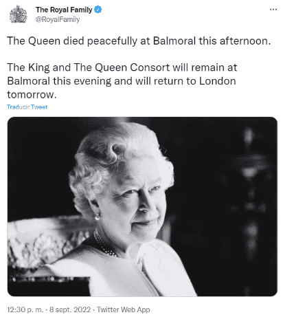 Poco antes de las 13:00 horas de hoy jueves 8 de septiembre, el Palacio de Buckingham anunció que la reina Isabel II murió a los 96 años en el castillo de Balmoral, en Escocia.