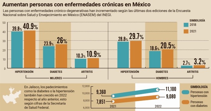 María Esther Méndez, de 59 años, padece hipertensión y diabetes, por lo que debe acudir al Instituto Mexicano del Seguro Social (IMSS) para recibir los medicamentos que le permiten controlar sus niveles de glucosa y de presión para tener una mejor calidad de vida. “La hipertensión la padezco desde hace como 10 años y la diabetes desde hace como tres. A veces me empiezo a sentir mareada cuando se me sube la presión o el azúcar y tengo que descansar o tomarme mis medicinas”, dijo al salir de la clínica 51 del IMSS. Igual que María Esther, la mayor parte de los mayores de 50 años tienen problemas de salud similares, según la más reciente Encuesta Nacional sobre Salud y Envejecimiento en México, elaborada por el Instituto Nacional de Estadística y Geografía. A estos padecimientos se suman otros como la artritis y las enfermedades agudas en vías respiratorias, como el COVID-19 y la influenza. También destacan las infecciones de las vías urinarias, así como las intestinales, que son las más comunes.Caso similar al de María Esther y millones de mexicanos es el de Gustavo Cuéllar, quien tiene 65 años de edad, aunque desde hace más de 10 se le detectó diabetes. Él comentó que no se agrava su salud pese a la enfermedad, ya que se toma sus medicinas adecuadamente y cuida su alimentación para evitar algún sobresalto.La Encuesta Nacional sobre Salud y Envejecimiento en México (ENASEM) del Instituto Nacional de Estadística, Geografía e Informática (INEGI), en su última edición de 2022, indicó que la hipertensión, la diabetes y la artritis son las enfermedades más comunes entre la población mayor de 50 años de edad.El doctor Martín Dávalos Gómez, médico geriatra del Antiguo Hospital Civil de Guadalajara “Fray Antonio Alcalde”, confirmó que la hipertensión y la diabetes están más presentes en mujeres, mientras que en los hombres, la principal problemática de salud se debe a los cambios en la presión arterial, alteraciones en la glucosa y la próstata con el avance del tiempo.“Los pacientes empiezan a tener cambios en la presión arterial, los niveles de glucosa y algunas alteraciones, en el caso de los hombres, de tipo prostático. En el caso de las mujeres, pueden tener problemas de mama, pueden tener problemas cervicouterinos y pueden tener problemas de hipertensión y diabetes. Son las crónico-degenerativas con más frecuencia”.Un paciente con problemas de presión es Gustavo Cuéllar, tiene 65 años de edad, aunque desde hace más de 10 años comenzó con problemas de hipertensión y debe tener cuidado cuando realiza actividades que le provoquen un aumento en su presión arterial porque se agita. “Nada más cuando me agito, pero eso es en parte por la presión, porque me agito y se me baja la presión”.María Esther Méndez, de 59 años, padece hipertensión y diabetes: en el primer caso, comenzó con este problema desde hace 10 años, mientras que la diabetes le fue detectada hace apenas 3 años. Dijo que, cuando se le sube la presión, se comienza a sentir mareada, por ejemplo, cuando camina mucho.“A veces me empiezo a sentir mareada cuando se me sube la presión o el azúcar, y tengo que descansar o tomar mis medicinas para que no se me suba y pase algo peor”, dijo a este medio, visiblemente cansada mientras caminaba por el Centro Histórico de Guadalajara cuando se dirigía a desayunar.Ambos tienen la ventaja de contar con seguridad social, en este caso, se atienden en el Instituto Mexicano del Seguro Social (IMSS), donde reciben las medicinas que requieren y tampoco han tenido complicaciones de gravedad por el medicamento que reciben.“Tomo medicamentos en la mañana y en la noche: glibenclamida y metformina. Tengo prohibido comer azúcar, pan, pero de vez en cuando sí puedo comerlo”, dijo el señor Gustavo.PREVENCIÓNEs justo la herencia genética y antecedentes familiares uno de los factores que pueden llevar a desarrollar padecimientos como la diabetes, hipertensión o artritis, esto de acuerdo con el National Heart, Lung and Blood Institute, institución de salud con sede en Estados Unidos.Las enfermedades como la hipertensión y la diabetes tienen causas que pueden provocar su desarrollo, entre estas, están las siguientes: La principal recomendación médica para llevar un tratamiento adecuado y evitar las consecuencias es la detección oportuna; el doctor Martín Dávalos, del Hospital Civil de Guadalajara, resaltó que se debe detectar oportunamente para analizar el proceso médico que se tiene que implementar, así como sus complementos. “Requiere la detección oportuna de enfermedades, entonces hay enfermedades que luego no requieren tratamiento médico, requieren recomendaciones higiénico-dietéticas, por ejemplo, cambios en la alimentación. Por ejemplo, a las personas elevadas de la presión arterial, les recomendamos dietas bajas en sodio, bajas en sal. Los que tienen un poquito elevada la glucosa más actividad física más agua natural y disminuir la cantidad de carbohidratos o de azúcares en los alimentos”. El médico del Hospital Civil señaló que, en caso de no atenderse correctamente y a tiempo, se pueden presentar afectaciones en la salud a causa de las distintas enfermedades como la diabetes o artritis. “El paciente va a presentar molestias, alteraciones. El que tiene artritis va a presentar inflamación en las articulaciones, va a tener dolor articular. El paciente que tiene diabetes y no se le ha controlado, va a tener alteraciones visuales, va a tener complicaciones renales, complicaciones de la transmisión nerviosa, llamada neuropatía diabética, problemas en sus arterias y venas. Igual va a pasar con el paciente que no se atienda las vías respiratorias y esto puede hacerse una infección en las vías respiratorias bajas y puede complicarse con una neumonía”. GUÍALa Secretaría de Salud Federal ha dispuesto de una guía con recomendaciones para el tratamiento de la hipertensió