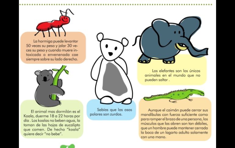 Suplementos | ''El Intrépido Vulcano y el Barón De la Cantolla'' Divertinotas El libro más pequeño del mundo Por: EL INFORMADOR 16 de marzo de 2011 - 02:17 hs Los elefantes son los únicos animales en el mundo que no pueden saltar . EL INFORMADOR / GUADALAJARA, JALISCO (16/MAR/2011).- Teatro “El Intrépido Vulcano” y el Barón De la Cantolla Ésta es la historia de cómo Vulcano conoce al gran Barón de la Cantolla, y junto con éste se dan cuenta de cómo ha cambiado el paisaje boscoso mexicano. El Barón le cuenta a Vulcano que tan importantes son los bosques y por qué hay que cuidarlos, también le explica porque vuelan los globos aerostáticos entre otras cosas. Cantolla Divertinotas¿Qué crees…?El libro más pequeño del mundo Mide cinco milímetros y en sus páginas reproduce el 'Padre Nuestro' completo en varios idiomas. Está encuadernado en cuero verde oscuro con detalles de oro y viene acondicionado en una minúscula caja provista de una lupa. Sabías que los osos polares son zurdos. La hormiga puede levantar 50 veces su peso y jalar 30 veces su peso y cuando muere intoxicada o envenenada cae siempre sobre su lado derecho. La pulga puede saltar 350 veces su longitud, es como si un humano saltara la longitud de una cancha de fútbol. La cucaracha puede vivir 9 días sin su cabeza, antes de morir de hambre. Los elefantes son los únicos animales en el mundo que no pueden saltar . Aunque el caimán puede cerrar sus mandíbulas con fuerza suficiente como para romper el brazo de una persona, los músculos que las abren son tan débiles, que un hombre puede mantener cerrada la boca de un lagarto adulto solamente con una mano El animal mas dormilón es el Koala, duerme 18 a 22 horas por día . Los koalas no beben agua, la toman de las hojas de eucalipto que comen. De hecho “koala” quiere decir “no bebe”. Temas Pingo Recibe las últimas noticias en tu e-mail Todo lo que necesitas saber para comenzar tu día Registrarse implica aceptar los Términos y Condiciones