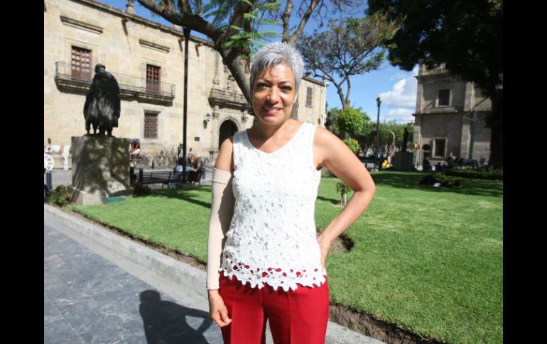 María Isabel Becerra usa la manga preventiva en el brazo derecho para tratar el linfedema. EL INFORMADOR / R. Tamayo