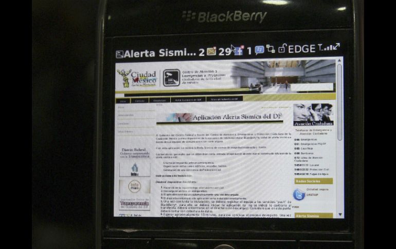 Tecnología | Blackberry podrá avisar a través de una alerta sonora y la vibración del dispositivo ''Alerta sísmica'', nueva aplicación de GDF en celulares La aplicación se podrá descargar de forma gratuita, como parte de la medidas de prevención en caso de sismo Por: SUN 3 de abril de 2012 - 17:29 hs La aplicación de alerta sísmica para los dispositivo de Blackberry es gratuita. REUTERS / CIUDAD DE MÉXICO (03/ABR/2012).- Aproximadamente 50 segundos antes de que inicie un sismo, un teléfono Blackberry podrá avisar a los usuarios sobre el movimiento a través de una alerta sonora y la vibración del dispositivo. El gobierno del Distrito Federal dio a conocer este martes la nueva aplicación para los dispositivo móviles, la cual se podrá descargar de forma gratuita, como parte de la medidas de prevención en caso de sismo. Marcelo Ebrard, jefe de gobierno capitalino, explicó que esta aplicación está conectada a la señal pública de alerta de sismos a cargo de C4, por lo cual no tendrá ningún costo. Adelantó que en un plazo de no más de 60 días también se instalarán mil 800 altavoces en las calles de la ciudad, así como 50 mil radios en cada uno de los salones de las escuela del Distrito Federal, lo cuales emitirán la alerta sísmica. "El objetivo es tener el sistema de alertamiento sísmico más completo de todos los sistemas actuales. Esta tecnología no se tuvo en los sismos de 1985, si se hubiera tenido se habrían salvado miles de personas", comentó. La aplicación de alerta sísmica para los dispositivo de Blackberry, de cualquier compañía telefónica, se puede descargar en la página de internet www.caepccm.df.gob.mx, una vez instalada se generará un icono, el cual emitirá la alerta aún cuando el teléfono celular este en modo de silencio. Temas Gadgets Sismos nacional BlackBerry Aplicaciones Lee También Autoridades despliegan elementos para apoyar a la población afectada por las lluvias Enfrentamiento por error entre Guardia Nacional y Policía de Sinaloa deja un muerto Terremoto de magnitud 7.6 sacude el sur de Filipinas Chivas viaja con ‘Chicharito’ y Robinho al amistoso ante América en Estados Unidos Recibe las últimas noticias en tu e-mail Todo lo que necesitas saber para comenzar tu día Registrarse implica aceptar los Términos y Condiciones