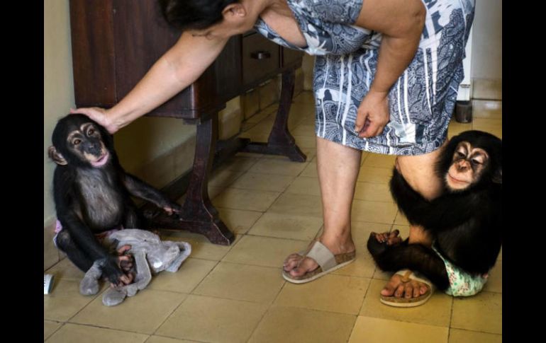 LA HABANA, CUBA (08/ABR/2017).- En el último año Marta Llanes se quedó sin televisor, su teléfono fue masticado y perdió muchos de sus muebles, pero como buena madre abnegada cuando sus chimpancés bebés la abrazan o se prenden de sus piernas olvida todos los disgustos.La bióloga cubana de 62 años se autoimpuso sacar adelante a dos crías de Pan troglodytes -conocidos popularmente como chimpancé común-, una especie de primates homínidos oriunda de África en peligro de extinción y que, evolutivamente hablando, es la más cercana a los humanos.Los peludos y traviesos Ada y Anumá II, que jugueteaban en la sala del departamento de Llanes, no son los primeros hijos adoptivos de esta especialista del zoológico de La Habana: desde 1983 crió en su propio hogar a por lo menos 10 bebés chimpancés."Hay que estar en casa las 24 horas con ellos", explicó Llanes, quien se levanta cada mañana a las cinco para prepararles el desayuno y no se detiene hasta las 10 de la noche cuando ellos se van a dormir. "Para nosotros es un animal muy importante porque está en serio peligro de extinción", agregó.La bióloga solo sale de su vivienda algunas horas los lunes o martes cuando otro especialista del zoológico la visita y trae algunos víveres o productos de higiene.Con el piso regado de juguetes, todos los objetos cortantes o punzantes colocados a cierta altura y los tomacorrientes cubiertos para evitar un accidente, la hembra Ada, de 13 meses, y el macho Anumá II, de 15, correteaban dando pequeños mordiscones y tocando todo lo que estaba al alcance de sus manos de largos dedos y piel suave, mientras observaban con sus ojos vivaces y olisqueaban con su ancha nariz a su benefactora.A su alrededor había dispersos algunos pozuelos plásticos y muñecos que arrastraban o se ponían en la cabeza mientras caminaban balanceándose cubiertos por pañales improvisados."Trato de ser una madre chimpancé. Ellos me dicen 'ju' yo también les hago 'ju''', explicó Llanes. "Hay que enseñarles a trepar, enseñarles a hacer de todo".Según expertos la rama evolutiva del chimpancé común, que comparte su ADN en más de 90% con los humanos, se separó del hombre hace unos siete millones de años. Se caracterizan por su inteligencia y el uso de herramientas elementales. En su hábitat natural viven entre 40 y 50 años y en cautiverio unos 60.Llanes asumió su cuidado luego de que su madre biológica mostró desinterés en cuidarlos, alimentarlos y limpiarlos de manera adecuada."Las hembras que tenemos en el zoológico son muy jóvenes y no han aprendido a criar, es un componente de aprendizaje y genético", explicó.La bióloga esperará al menos un mes más, en el cual ya estarán muy grandes para su apartamento, antes de retornarlos al zoológico, donde se está construyendo un área especial para la cría artificial y se buscan intercambios con otras instituciones de Guatemala o México para que la especie se reproduzca en cautiverio pero evitando la endogamia, que es alta entre estos animales en Cuba.Aunque Llanes vive en un edificio sus vecinos aseguraron que la convivencia es armoniosa y los animales no ocasionan problemas."No molestan a nadie y son adorables", dijo a AP Cari Dib, un ama de casa de 65 años que reside en la planta baja. "Independientemente de que ella es bióloga, su actitud para criar a estos chimpancés es muy humana".