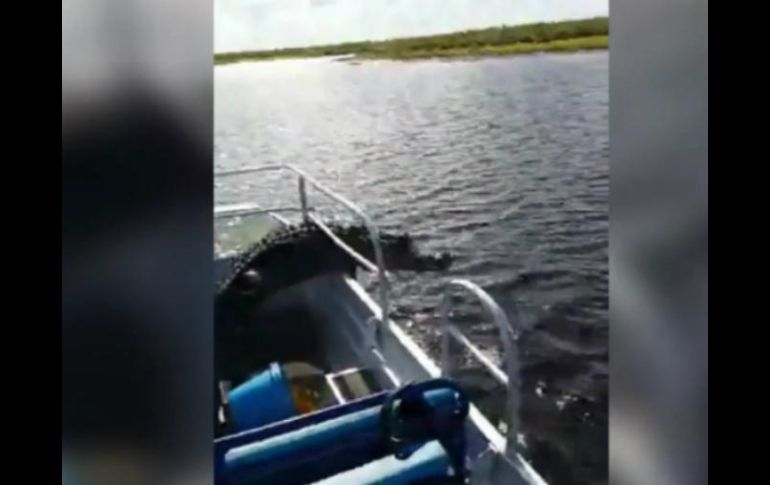 MIAMI, ESTADOS UNIDOS (20/ENE/2017).- Un caimán pegó el susto de su vida a unos turistas al brincar en el bote que los conducía por los pantanos de Daytona Beach en Florida y una pareja de Missouri captó el encuentro con el reptil en vivo en redes sociales. Tylor Hindery y su esposa Esmeralda participaban de la excursión guiada cuando su barco se acercó a un gran caimán que tras unos segundos inmóvil decidió brincar dentro de la embarcación. La pareja señaló a la prensa de Florida que el viento acercó el barco al banco de barro y eso permitió al reptil subir al bote. "Por unos segundos fue como si esto no estuviera pasando en la vida real", dijo Tylor Hindery al canal de noticias KY3. El caimán corrió rápidamente hacia el otro lado del bote y tras quedar atorado en los varandales metálicos logró caer en el agua. Tylor contó a la televisora que él estaba captando el momento en vivo en video en Facebook y que sus familiares se preocuparon porque pensaron que algo le pasaría. Puedes ver el video aquí.