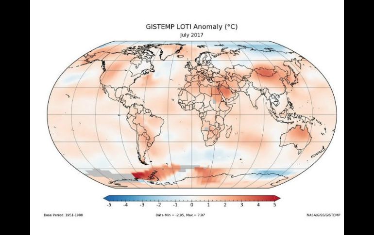 CIUDAD DE MÉXICO (15/AGO/2017).- El mes de julio pasado fue el más caluroso de todos esos periodos en los últimos 137 años, de acuerdo a los registros modernos, con 0.83 grados Celsius por encima de la temperatura media más caliente entre 1951-1980. Con base en el análisis mensual de temperatura global que realizan científicos del Instituto Goddard de Estudios Espaciales (GISS, por sus siglas en inglés) de la NASA en Nueva York, sólo julio 2016 mostró una temperatura similar, con 0.82 grados Celsius. Dicho estudio del equipo de científicos se lleva a cabo mediante los datos obtenidos por las personas de cerca de seis mil 300 estaciones meteorológicas de todo el mundo, informó la Administración Nacional de la Aeronáutica y del Espacio (NASA, por sus siglas en inglés). Para el desarrollo del monitoreo se emplean instrumentos basados en buques y boyas que miden la temperatura de la superficie del mar, y estaciones de investigación antárticas. El registro de temperatura global moderno inicia alrededor de 1880, porque las observaciones anteriores no cubrieron de forma adecuada todo el planeta.