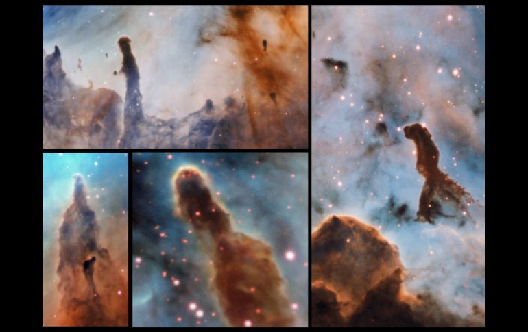 BERLÍN, ALEMANIA (02/NOV/2016).- Un equipo internacional de astrónomos ha captado imágenes de las enormes estructuras en forma de torres que hay en el interior de la nebulosa de Carina, inmensas nubes de polvo y gas dentro de un centro de formación de estrellas que se encuentra, aproximadamente, a siete mil 500 años luz de distancia.Parecen ser, según explicó hoy en un comunicado el Observatorio Europeo Austral (ESO), los "pilares de la destrucción", en contraste con el apodo de los icónicos "pilares de la creación" de la nebulosa del Águila, de naturaleza similar.Las imágenes muestran estrellas masivas que destruyen las nubes de polvo y gas de las que nacen.Estas formas australes fueron observados por un equipo dirigido por Anna McLeod, estudiante de doctorado en ESO, utilizando el espectrógrafo de campo integral MUSE, instalado en el telescopio de largo alcance (VLT, por su siglas en inglés) en el Observatorio Paranal, en Chile.Su trabajo, publicado en la revista Monthly Notices of the Royal Astronomical Society, combinó las imágenes obtenidas con otras que muestran estructuras similares como los famosos "pilares de la creación, en la nebulosa del Águila.El estudio muestra un vínculo claro entre la radiación emitida por estrellas masivas cercanas y las características de los propios pilares.Una de las primeras consecuencias de la formación de una estrella masiva, con potente radiación ionizante, es que comienza a destruir la nube en la que nació.La idea de que las estrellas masivas tienen un efecto considerable en su entorno no es nueva, sin embargo, es muy difícil obtener evidencia observacional de la interacción entre estas estrellas y su entorno.El equipo analizó el efecto de esta radiación energética en los pilares a través de la fotoevaporación, el cual concluyó que había una clara correlación entre la cantidad de radiación ionizante emitida por las estrellas cercanas y la disipación de los pilares.Según el Observatorio, aún no se comprende bien la complejidad de los mecanismos de retroalimentación entre las estrellas y los pilares, aspecto que continuará estudiando a futuro.
