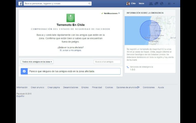 Tecnología | ''Safety check'' da cuenta de esto a quienes están en la zona del siniestro Facebook permite informar estado tras sismo en Chile ''Safety check'' da cuenta de esto a quienes están en la zona del siniestro Por: AFP 17 de septiembre de 2015 - 07:05 hs SANTIAGO, CHILE (17/SEP/2015).- Facebook activó una herramienta de geolocalización en Chile para que los usuarios den cuenta de su estado tras el potente terremoto de 8.3 grados que sacudió al país la noche del miércoles y que causó ocho muertos y un desaparecido. La herramienta, llamada "Safety check" (Comprobación del estado de seguridad), permite a quienes se encuentran en la zona del siniestro dar cuenta de su estado, así como estar informados sobre el estado de sus amigos. "Conéctate con tus amigos y seres queridos durante una catástrofe", indica la aplicación, que permite tres opciones al usuario: "consulta las notificaciones (si estás cerca de una catástrofe, te preguntaremos si estás bien), confirma que estás bien (si estás bien, toca o haz clic en el botón 'Estoy bien') y comprueba cómo están los demás (te avisaremos cuando tus amigos confirmen que están bien)". "Safety Check" fue creada en octubre de 2014 y fue utilizada con éxito tras el terremoto de Nepal el pasado mes de abril. "La herramienta se activa cuando se produce un desastre natural. Si estás en la zona afectada, recibirás una notificación de Facebook en la que te preguntaremos si estás bien", explica la red social. "Para determinar dónde estás, nos basaremos en la ciudad asociada a tu perfil, en tu última ubicación (...) y en la ciudad desde la que te conectas a internet. Si nos equivocamos, puedes indicar que no estás en la zona afectada", indica. La red social empezó a desarrollar esta aplicación tras el terremoto y el tsunami de Japón en 2011, configurando primero un tablón de anuncios y más tarde la herramienta actual. "Durante la crisis, comprobamos que la gente se sirve de la tecnología y las redes sociales para permanecer en contacto con sus seres queridos", escribió Facebook en su página web. Temas Internet Facebook Redes Sociales Sismo en Chile Lee También Internet Bienestar: Pasos para conservar tu número móvil Esta es la verdadera identidad del "Juan Gabriel" captado en París "Streamer" transmite su parto en vivo y causa revuelo en redes sociales Así puedes comenzar tu ahorro en el Banco del Bienestar Recibe las últimas noticias en tu e-mail Todo lo que necesitas saber para comenzar tu día Registrarse implica aceptar los Términos y Condiciones