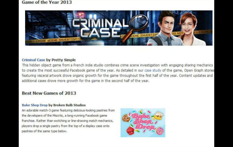 Dentro de la selección de los 23 juegos más populares, se distinguen varias categorías como: - ''Juego del año'', que se lo llevó ''Criminal case''. - ''Mejores nuevos juegos'', entre los que se destacan ''Bake Shop Drop'', ''Farm Heroes Saga'' y ''Heart of Vegas''. - ''Salón de la fama'', con aquellos juegos que se lanzaron antes de 2013 pero que siguieron arrasando en este año, tales como ''Candy crush'', ''Farmville'' y ''Double down casino'', entre otros. Checa la lista completa de los juegos en: http://goo.gl/9dI82i EL INFORMADOR / ALEJANDRA GALLARDO