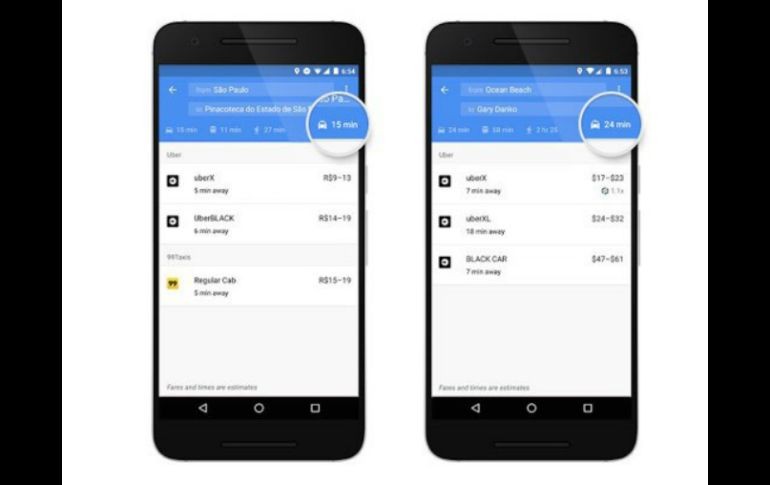 Tecnología | La 'app' también se encargará de mostrar la cuota estimada del servicio Google Maps añade tiempos estimados en taxi y Uber La 'app' también se encargará de mostrar la cuota estimada del servicio Por: SUN 17 de marzo de 2016 - 13:35 hs En cuanto a Uber, Google Maps mostrará las tarifas de UberX, UberXL y UberBlack. ESPECIAL / CIUDAD DE MÉXICO (17/MAR/2016).- Google Maps se ha convertido en una herramienta importante que nos ayuda a ubicarnos en cualquier ciudad del mundo. Por esta razón, la app añadió nuevas opciones al momento de tomar un servicio de taxi, ya que mostrará los tiempos estimados para diferentes empresas privadas y públicas que ofrecen transportación de pasajeros. También la app se encargará de mostrar la cuota estimada del servicio, para ello se deberá tener instalada la aplicación que planeas usar (por ejemplo, Uber). Asimismo mostrará el tiempo estimado de llegada al destino marcado, el tiempo que tardará el taxi a nuestra ubicación. Incluso se podrá comparar los distintos servicios de taxi que hay en la ciudad y elegir el que más te convenga. En cuanto a Uber, Google Maps mostrará las tarifas de UberX, UberXL y UberBlack. Estas nuevas funciones están disponibles para usuarios de Android. Se espera que para otras plataformas la actualización llegue en las próximas semanas. Temas Internet Google Aplicaciones Uber Lee También Los mejores Day pass en GDL, según calificaciones de Google Así puedes evitar estafas con las apps de préstamos ¿Qué tipo de documentos no deberías escanear en WhatsApp para evitar fraudes? Cómo borrar el caché de WhatsApp para que el celular no se haga lento Recibe las últimas noticias en tu e-mail Todo lo que necesitas saber para comenzar tu día Registrarse implica aceptar los Términos y Condiciones