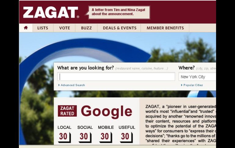 Tecnología | Esta empresa ofrece críticas de restaurantes en más de 100 ciudades del mundo Google compra la guía de restaurantes Zagat Esta empresa ofrece críticas de restaurantes en más de 100 ciudades del mundo Por: AFP 8 de septiembre de 2011 - 12:41 hs Zagat fue fundada hace más de 30 años. Imagen de la página oficial de Zagat. ESPECIAL / SAN FRANCISCO, EU (08/SEP/2011).- El gigante estadounidense de internet Google anunció el jueves la compra de la guía de restaurantes Zagat, por un precio no precisado. Zagat fue fundada hace más de 30 años y ofrece críticas de restaurantes en más de 100 ciudades de todo el mundo. "Zagat será una piedra angular de nuestra oferta de locales, deleitando a la gente con su impresionante variedad de opiniones, valoraciones y puntos de vista", dijo la vicepresidente de Google, Marissa Mayer, en un blog del grupo. "Con Zagat, ganamos a un equipo de clase mundial que conoce más al consumidor, en base a encuestas, recomendaciones y críticas, que nadie en la industria", dijo Mayer. Temas Internet Google Páginas Web Lee También Plataforma de Hulu llegará a México; esto se sabe ¿Cómo desactivar paso a paso las respuestas de IA en Google? ¿Cómo restaurar fotos antiguas con Gemini paso a paso? ¿Cómo funciona la dieta cognitiva? Recibe las últimas noticias en tu e-mail Todo lo que necesitas saber para comenzar tu día Registrarse implica aceptar los Términos y Condiciones