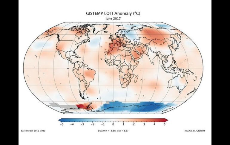 CIUDAD DE MÉXICO (14/JUL/2017).- El mes pasado fue el cuarto más caluroso de todos los meses de junio en los últimos 137 años, de acuerdo a los registros modernos, con 0.69 grados Celsius por encima de la temperatura media más caliente del periodo 1951-1980. A junio 2017 lo superan, el del año 2016 (+0.79 grados Celcius). 2015 y 1998 (+0.78 ° C), informó la Administración Nacional de la Aeronáutica y del Espacio (NASA, por sus siglas en inglés), en su portal de Cambio Climático. Dentro del informe detallan que los 10 meses más calurosos de junio ocurrieron entre 2005 y 2017. El estudio mensual del equipo se lleva a cabo mediante los datos obtenidos por el público de cerca de 6 mil 300 estaciones meteorológicas de todo el mundo. Para el desarrollo del monitoreo se emplean instrumentos basados en buques y boyas que miden la temperatura de la superficie del mar y estaciones de investigación antárticas. El registro de temperatura global moderno inicia alrededor de 1880 porque las observaciones anteriores no cubrieron de forma adecuada el planeta.