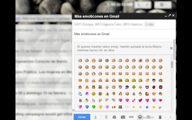 Tecnología | Estrenan más de mil nuevas opciones para ilustrar los correos electrónicos Más emoticones en Gmail Estos gráficos incluyen algunas microanimaciones, que en la ventana para usarlos son llamados ''emoji'' Por: EL INFORMADOR 8 de febrero de 2013 - 17:05 hs Los nuevos emoticones serán habilitados para todas las cuentas de manera paulatina. ESPECIAL / GUADALAJARA, JALISCO (08/FEB/2013).- Al parecer Google se ha vuelto fanático de los emoticones y después de esta noticia muchos dirán que quizá se está excediendo, pues agregó ¡más de mil nuevos íconos gestuales! Estos gráficos incluyen algunas microanimaciones, que en la ventana para usarlos son llamados "emoji", para aquellos momentos en los que es mejor agregar una imagen en vez de escribir. Quienes usen el sistema de mensajería para dispositivos móviles, WhatsApp podrán comparar la similitud de ilustraciones que ahora están disponibles en el correo de Google. Para encontrarlos hay que tener activada la función de redactar correo en una ventana emergente (funciona en Google Chrome) y encontrar el símbolo “+” que aparece en la barra de herramientas que está a la derecha del botón “Enviar”, ahí se desplegará el mosaico de nuevas opciones para personalizar los mensajes electrónicos. Los nuevos emoticones serán habilitados para todas las cuentas de manera paulatina, pero al paso de los días todas las cuentas podrán usar la nueva función. De momento no se sabe si Google hará extensivo el uso de esta nueva variedad de "emoji" en su sistema de chat Talk, de ser así entonces podría tomar un estilo semejante al que tenía el MSN Messenger, a punto de desaparecer para siempre el próximo 15 de marzo. EL INFORMADOR / SERGIO RODRÍGUEZ Temas Internet Google Páginas Web Lee También Los mejores Day pass en GDL, según calificaciones de Google Los sesgos de género prevalecen en internet Internet Bienestar: Pasos para conservar tu número móvil Plataforma de Hulu llegará a México; esto se sabe Recibe las últimas noticias en tu e-mail Todo lo que necesitas saber para comenzar tu día Registrarse implica aceptar los Términos y Condiciones