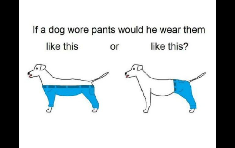 Tecnología | Usuarios opinan sobre cuál sería la forma correcta en la que perros vistan pantalones 'Pantalones para perro' divide opiniones en Twitter Usuarios opinan sobre cuál sería la forma correcta en la que perros vistan pantalones Por: EL INFORMADOR 30 de diciembre de 2015 - 10:30 hs La imagen tiene más de 30 mil retuits. TWITTER / @jaredbkeller GUADALAJARA, JALISCO (30/DIC/2015).- De la misma forma en la que se viralizó aquella imagen de un vestido de color azul o dorado, a las redes sociales llega una nueva fotografía en la que hace una sencilla pregunta: "Si un perro usara pantalones, ¿cómo se vestiría?" cuestión que divide opiniones. La pregunta viene acompañada de dos opciones en las que, sobre la silueta de un perro, la primera cubre las cuatro patas del can, siendo prioridad vestir las extremidades; la segunda, es tapar los genitales del animal y las patas traseras. Tal cuestión ha dividido opiniones en Twitter y Facebook por parte de los usuarios. El usuario Jared Keller en Twitter fue en encargado de dar a conocer dicha imagen que hasta el momento tiene 31 mil 290 retuits. Aunque no se sabe la respuesta correcta, usuarios opinan y dan sus propias versiones de por qué los perros deberían vestir los pantalones incluso comparten imágenes de sus propias mascotas con esta prenda usando el "hashtag" #dogpants. Temas Internet Perro Twitter Curiosidades Redes Sociales Lee También ¿Qué pasa si duermo con mi perro todos los días? Internet Bienestar: Pasos para conservar tu número móvil Esta es la verdadera identidad del "Juan Gabriel" captado en París "Streamer" transmite su parto en vivo y causa revuelo en redes sociales Recibe las últimas noticias en tu e-mail Todo lo que necesitas saber para comenzar tu día Registrarse implica aceptar los Términos y Condiciones