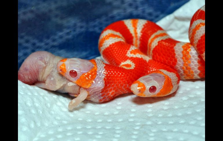 Tecnología | Incubada en Florida, su primer alimento fue una cría de ratón muerta y descongelada Rara serpiente albina de dos cabezas engulle su primera comida Las serpientes de dos cabezas viven hasta veinte años en cautiverio Por: EFE 21 de noviembre de 2011 - 18:36 hs Serpiente de leche hondureña albina que nació con dos cabezas en una incubadora en Florida. EFE / MIAMI, FLORIA (21/NOV/2011).- Una excepcional serpiente de leche hondureña albina que nació con dos cabezas en una incubadora en Florida en octubre pasado tomó su primera comida: una cría de ratón muerta y descongelada. La organización Sunshine Serpents informó hoy de que, como suele suceder en la mayor parte de los ofidios, este raro ejemplar de serpiente albina de dos cabezas comió por fin su primera comida después de haber cambiado por primera vez su piel. "Se ha documentado que las serpientes de dos cabezas viven hasta veinte años en cautiverio. Con dos cerebros dando órdenes a un solo cuerpo, debe ser una existencia confusa. Esta culebra con seguridad no podría sobrevivir en estado silvestre", apuntó el biólogo estadounidense Daniel Parker. Parker, de la Universidad Central de Florida (UCF) y responsable de la organización Sunshine Serpents, explicó hoy en un comunicado que la cabeza derecha de la serpiente fue la que se tragó el pequeño ratón que le trajeron de comida, mientras que la otra cabeza miraba. El científico indicó que la mayoría de las serpientes con dos cabezas tienen una coloración típica, "haciendo extremadamente rara" a esta serpiente, un hecho que podría hacer de este ejemplar la más hermosa serpiente de dos cabezas nunca vista. Explicó que las serpientes albinas pierden toda la pigmentación oscura, que en el caso de las culebras de leche es rojo, anaranjado y blanco. El científico ha puesto a la venta este ejemplar, por un mínimo de 25.000 dólares, con el ánimo de que alguna institución lo compre y dedicar el dinero conseguido a financiar sus investigaciones: "Espero que la adquiera alguna institución que la cuide y la muestre al público". Sobre la alimentación de las serpientes, Parker explicó que muchas personas creen erróneamente que los ofidios sólo se alimentan de otros animales vivos, pero el olor es el factor más importante. "Si huele como comida, la serpiente intentará probablemente comérselo, esté vivo o no", por lo que el alimento congelado es una buena alternativa a los ejemplares vivos. El nombre científico de la serpiente de leche hondureña, conocida también como coral falso, es Lampropeltis triangulum hondurensis. Temas Medio Ambiente Curiosidades y absurdos Animales Lee También Llega "La Niña" y este será su impacto según las predicciones Lista de frutas y alimentos que son de temporada en octubre Esta es la verdadera causa de muerte en personas con hígado graso Esto pagará Aldo de Nigris al SAT tras su paso por la LCDLFM 2025 Recibe las últimas noticias en tu e-mail Todo lo que necesitas saber para comenzar tu día Registrarse implica aceptar los Términos y Condiciones