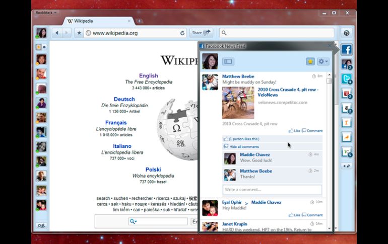 Tecnología | Este se basa en el sistema de la plataforma abierta 'Chromium' RockMelt, el más 'social' de los navegadores de Internet Su objetivo es lograr una mejor interacción con las redes sociales, compartir información y estar conectado con amigos Por: EL INFORMADOR 8 de noviembre de 2010 - 09:21 hs GUADALAJARA, JALISCO (08/NOV/2010).- A partir de este 8 de noviembre se suma un nuevo competidor a la guerra de navegadores donde ya compiten Internet Explorer, Firefox, Chrome, Opera y Safari. RockMelt, es el nombre de un nuevo navegador ideado por el fundador del desaparecido Netscape, Marc Andreessen. La base de RockMelt es lograr una mejor interacción con las redes sociales, compartir información y estar conectado con amigos, además de las indispensables búsquedas en portales web, según explica el blog especializado Fayer Wayer. “Tus amigos son importantes para ti, así que los integramos. Ahora podrás chatear, compartir videos de gatos que tocan el piano, o ver lo que están haciendo tus amigos, sin importar qué sitio estés navegando. RockMelt te dirá si algo nuevo está sucediendo”, explica el portal oficial de la compañía desarrolladora. El nuevo navegador de Internet está basado en el sistema de la plataforma abierta Chromium, así que a primera vista RockMelt tiene un look similar al “browser” de Google, Chrome, que hace poco más de un año se estrenó en la red con éxito. Desde hoy, RockMelt comenzará a liberar invitaciones para probar las primeras versiones del navegador, dada su integración con redes sociales, para tener derecho a una de estas versiones previas los usuarios que quieran ser los primeros en probarlo deben registrarse con su cuenta de Facebook en el sitio http://www.rockmelt.com/ EL INFORMADOR / SERGIO RODRÍGUEZ Temas Internet Google Redes Sociales Recibe las últimas noticias en tu e-mail Todo lo que necesitas saber para comenzar tu día Registrarse implica aceptar los Términos y Condiciones