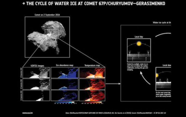 Tecnología | La sonda orbita en torno al cometa desde agosto del año pasado Sonda Rosetta descubre que hielo del cometa 67P desaparece cíclicamente Los expertos señalan que este fenómeno puede ser una característica general en la mayoría de los cometas Por: EFE 23 de septiembre de 2015 - 13:10 hs La cantidad de hielo en el cometa 67P aumenta en la sombra y decrece con la luz solar. TWITTER / @esa LONDRES, INGLATERRA (23/SEP/2015).- Observaciones de la sonda europea Rosetta sugieren que el hielo de la superficie del cometa 67P/Churyumov-Gerasimenko aparece y desaparece cíclicamente en función de la exposición a la luz solar, según un estudio publicado hoy en la revista Nature. La sonda de la Agencia Espacial Europea ( ESA) orbita desde agosto del año pasado en torno al cometa 67P, al que llegó tras viajar durante diez años. Los instrumentos que incorpora la nave, que orbita a 10 kilómetros de distancia del cuerpo celeste, han comprobado que la cantidad de agua helada en una región particular del cometa aumenta cuando está en sombra y decrece cuando queda expuesta a la luz. Un grupo de investigadores italianos liderado por Maria Cristina De Sanctis ha medido la concentración de hielo en el cuello del cometa, la zona estrecha en el centro de 67P; Sus indagaciones han revelado el patrón cíclico por el que varía el volumen de agua helada en la superficie del cometa, que coincide con los cambios en las condiciones de iluminación. Esas mediciones han sido posibles gracias a VIRTIS, un espectrómetro de luz visible e infrarroja fabricado por un consorcio italiano, francés y alemán. Asimismo, el estudio muestra que cuando esa zona del cometa queda expuesta a la luz solar, el incremento de temperatura en la superficie provoca la liberación de vapor de agua, un fenómeno que ya había sido observado en otros cuerpos similares. Los autores proponen que un ciclo diario ligado a la iluminación del sol puede explicar ese fenómeno en los cometas 9P/Tempel 1 y 103P/Hartley 2, y sugieren que ese proceso puede ser una característica general en la mayoría de cometas. Tras pasar por los asteroides Luichewoo, Steins y Lutetia, en 2005 tomó la primera imagen del cometa Tempel 1 y en su largo viaje pasó en tres ocasiones (2005, 2007 y 2009) cerca de la Tierra para aprovechar su fuerza de gravedad; en una ocasión (2007) recibió impulso de Marte. El 12 de noviembre de 2014, el módulo Philae, lanzado junto a la sonda, logró por primera vez en la historia aterrizar en la superficie de un cometa. Temas Naves espaciales Descubrimientos Espacio Astronomía La Agencia espacial Europea Cometa Lee También NASA confirma si el cometa 31/ATLAS amenaza la vida en la Tierra o no Detienen a cuatro jóvenes armados con fusiles automáticos en Sinaloa Asteroide pasó muy cerca de la Tierra; esto ocurrió Esto dijo Israel sobre la extradición de Zerón a México Recibe las últimas noticias en tu e-mail Todo lo que necesitas saber para comenzar tu día Registrarse implica aceptar los Términos y Condiciones