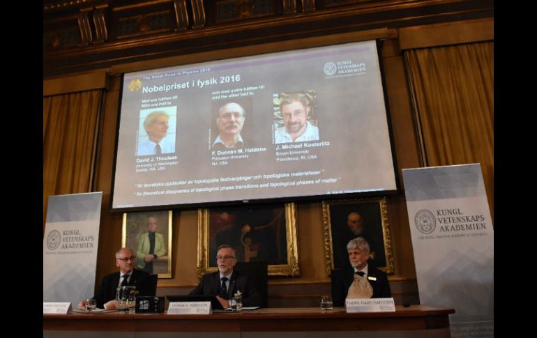 ESTOCOLMO, SUECIA (04/OCT/2016).- David Thouless, Duncan Haldane y Michael Kosterlitz ganaron el martes el Premio Nobel de Física por un trabajo que "reveló los secretos de la materia exótica", según el comité que concedió el galardón.Los tres científicos "abrieron la puerta" a un mundo desconocido en el que la materia asume estados o fases inusuales, explicó la Real Academia Sueca de Ciencias.La academia reconoció sus "descubrimientos teóricos sobre transiciones de fase topológicas y fases topológicas de materia".Thouless, de 82 años, es profesor emérito de la Universidad de Washington. Haldane, de 65, es profesor de física en la Universidad de Princeton en New Jersey. Kosterlitz, de 73 años, es profesor de física en la Universidad de Brown en Providence, Rhode Island.Su investigación se realizó en las décadas de 1970 y 1980. Los jueces del Nobel suelen premiar descubrimientos realizados décadas antes para asegurarse de que soportan el paso del tiempo.Los anuncios de los premiados de este año comenzaron el lunes con el Nobel de Medicina, concedido al biólogo japonés Yoshinori Ohsumi por descubrimientos sobre la autofagia, el proceso en el que una célula descompone y recicla contenido.El miércoles se anunciará el ganador del premio en química. El viernes se sabrá quién ganó el Nobel de la Paz, mientras que los galardonados en las categorías de Economía y Literatura se conocerán la semana que viene.Cada premio está valorado en ocho millones de coronas (930 mil dólares).