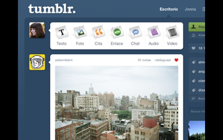 Tecnología | La red de blogs añade la lengua a su lista de opciones de idioma Tumblr, ahora en español El sitio se valora en 800 MDD Por: EL INFORMADOR 30 de agosto de 2011 - 14:04 hs Tumblr. ESPECIAL / ESTADOS UNIDOS (30/AGO/2011).-''¡Estamos muy emocionados para dar la bienvenida al español en nuestra lista de opciones de idiomas!'', así dio a conocer hoy el blog oficial de la red social Tumblr, al publicar la nueva opción de lenguaje de la página. El anuncio se hace presente ante una comunidad que se va familiarizando poco a poco con el sitio. ''El español es ahora nuestra séptima lengua, después del inglés, alemán, italiano, francés, japonés y turco; y esperamos que sean más'', dice el anuncio. Para cambiar a Español debe ir a la página de 'Configuración', y seleccionar en la casilla de idioma la opción 'Spanish'. Además, hay un blog del equipo en este idioma. El valor de la red crece El sitio de blogs está cerca de terminar una ronda de financiación para recaudar fondos que situaría su valor entorno a los 800 millones de dólares. Según informa The Wall Street Journal Tumblr recibirá una inyección de capital de entre 75 y 100 millones de dólares procedente de inversores, lo que representaría una valoración total de 800 millones de dólares. Según apunta Le Monde, el valor de Tumblr es similar al del grupo de medios del New York Times, que emplea a siete mil personas y está valorada en unos mil millones de dólares. Temas Redes Sociales Lee También Esta es la verdadera identidad del "Juan Gabriel" captado en París "Streamer" transmite su parto en vivo y causa revuelo en redes sociales Así puedes comenzar tu ahorro en el Banco del Bienestar CURP biométrica: ¿Será necesario tramitarla para los programas del Bienestar? Recibe las últimas noticias en tu e-mail Todo lo que necesitas saber para comenzar tu día Registrarse implica aceptar los Términos y Condiciones