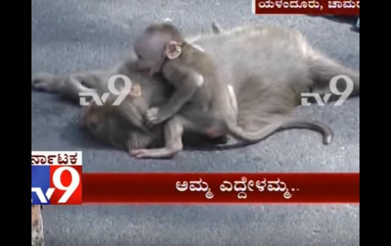 GUADALAJARA, JALISCO (12/MAR/2017).- Un video que muestra a una cría de mono mientras llora abrazado al cadáver de su madre, que fue atropellada en un accidente ocurrido en una ciudad de India, conmueve a miles de usuarios que lo han reproducido en YouTube. El video fue publicado en el canal TV9 Kannada y pertenece a un noticiario de TV9 News. Según lo que narran medios de comunicación, se trata de sucesos ocurridos en una carretera de Elanthur, al sur de India. Al parecer, un automovilista atropelló a la mona por accidente y la mató en el acto. La cría cruzó a la carretera y se quedó en el asfalto por varios minutos, mientras, al parecer, intentaba reanimarla. Para los usuarios de YouTube que han comentado el video, los ruidos que hace el animal mientras se aferra al cadáver de la madre son llantos y gemidos. Medios como el Times of India señalan que, según los testigos, varias personas "condujeron a los ritos finales" el cuerpo de la hembra adulta, mientras la cría las siguió desde árboles cercanos.