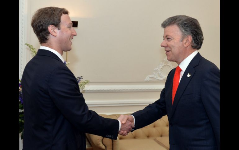 Zuckerberg, de 30 años y uno de los hombres más ricos del mundo tras desarrollar el gigante mundial Facebook, se reunió en Bogotá con el presidente Juan Manuel Santos para lanzar su proyecto Internet.org, que busca ampliar el acceso a esa red en todo el mundo mediante una drástica reducción del costo de los servicios en los teléfonos móviles en los países desarrollo."Dar a la gente las herramientas de conectividad es importante en sí mismo para crear comunicación. Creo que muchos de los conflictos son causados por malentendidos", dijo el famoso joven luego del encuentro privado con el mandatario.En la cita, en la que también participó el titular del Ministerio de Tecnologías de la Información y las Comunicaciones (MinTIC), Diego Molano, se selló un acuerdo que "permitirá que los colombianos que tengan celulares de baja gama accedan a contenidos en red para mejorar sus conocimientos, por ejemplo, en materia de agricultura, salud y educación", anunció Santos.Zuckerberg llegó a la presidencial Casa de Nariño acompañado de guardaespaldas y vistiendo un traje negro con corbata en lugar de su característica camiseta gris. Apenas ingresó al auditorio donde tuvo lugar un conversatorio con Santos fue aplaudido, e incluso se escuchó un grito en inglés "¡Eres impresionante!".Ante unas 100 personas, entre representantes del gobierno, creadores de aplicaciones y periodistas, un sonriente Zuckerberg destacó las ventajas de su plan para el primer país latinoamericano donde promueve la iniciativa."Internet en su conjunto y las redes sociales traerán reconciliación y paz", dijo el famoso joven, cuya biografía inspiró la premiada película "La Red Social". "Si se dan las herramientas y la infraestructura que la gente necesita de forma gratuita, entonces todo el mundo va a tener una base para construir prosperidad", agregó.Internet.org, creada por Zuckerberg junto con otras empresas de tecnología, como Ericsson, Mediatek, Opera, Samsung, Nokia y Qualcomm, se enmarca en la misma filosofía de "conectar a todos" con que nació Facebook."Me parece bacano", el Facebook colombianoColombia, primer país de América y cuarto del mundo en adoptar Internet.org después de Zambia, Kenia y Tanzania, según el sitio web del proyecto, fue elegido por Facebook por los resultados obtenidos desde 2010 con el plan Vive Digital, una estrategia gubernamental que busca la masificación de Internet.Santos contó que el nexo Colombia-Facebook se originó en 2013 durante un encuentro con el presidente estadounidense Barack Obama.Inicialmente, Internet.org estará disponible para los clientes de planes prepago de la empresa Tigo, pero el gobierno colombiano prevé que otros operadores se unan en el futuro.La aplicación, que podrá ser descargada por los usuarios de Tigo desde el sistema operativo Android, reemplazará las usuales frases de Facebook "Me gusta" o "Amigos" por coloquialismos colombianos, como "Me parece bacano" o "Parceros".La navegación básica será financiada por Facebook y unos ocho millones de usuarios en toda Colombia podrán beneficiarse de la medida, según la compañía.Tras la reunión con el jefe de Estado colombiano, quien le regaló una pequeña paloma de la paz para prenderse en la solapa del traje, Zuckerberg hizo su primera sesión de preguntas y respuestas "Q&A with Mark" con los usuarios de Facebook fuera de Estados Unidos, en la privada Universidad Javeriana."El costo total de estar conectado es el precio del computador o el teléfono mas el acceso a datos. Una vez hayamos cumplido la promesa de llevar servicios básicos y conectividad, nos enfocaremos probablemente en bajar también el precio de los teléfonos", dijo Zuckerberg en ese conversatorio, vestido nuevamente con su característica camiseta gris.El emprendedor, cuya fortuna alcanza los 32.400 millones de dólares según la revista Forbes, respondió durante una hora inquietudes de estudiantes, empresarios e internautas sobre Facebook, una red social que en 2014 contaba con unos 1.320 millones de usuarios registrados en 110 idiomas.En Colombia, a fines de 2013 el número de conexiones a Internet fijo y móvil era de más de nueve millones de suscriptores, en un país de casi 48 millones de habitantes, según datos oficiales.