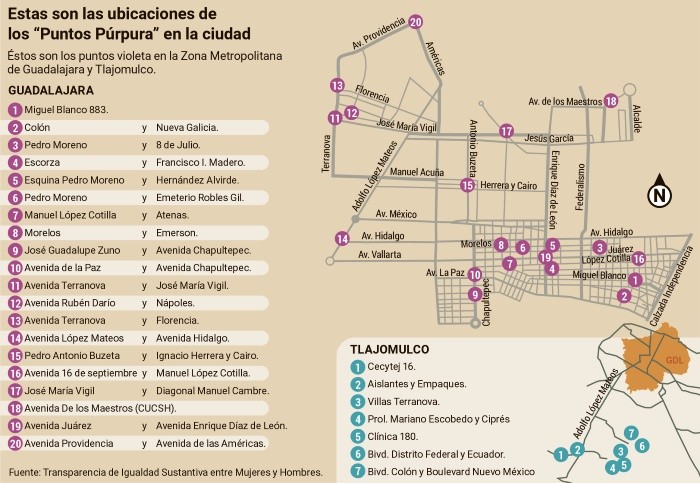 La estrategia “Puntos Púrpura” contempla la instalación de módulos de seguridad o tótem en 27 espacios de la ciudad, de los cuales 20 están en Guadalajara y siete en Tlajomulco. Sobre resultados en relación en general, además de uso, reportes y detenciones, se le pidió por Transparencia la información a la Secretaría de Igualdad Sustantiva entre Mujeres y Hombres (SISEMH) y al Centro de Coordinación, Comando, Control, Comunicaciones y Cómputo del Estado de Jalisco (Escudo Urbano C5), sin embargo, ambos se “echaron la bolita” respecto a la atribución de la información.La SISEMH, quien impulsa el programa, respondió a través de la Dirección de Prevención de las Violencias que eso no estaba dentro de sus atribuciones.“Es competencia del Centro de Coordinación, Comando, Control, Comunicaciones y Cómputo del Estado de Jalisco (Escudo Urbano C5), la Secretaría de Seguridad y la Comisaría de Policía de Guadalajara la videovigilancia de los Puntos de Monitoreo Inteligente (PIM), así como la recepción de los reportes de emergencia por Botón de Pánico Físico”.Por su parte, el C5 indicó que se presume que la información relacionada obra en los archivos de la Secretaría de Igualdad Sustantiva, “por ser la autoridad competente para la implementación de dicha estrategia. Ahora bien, por lo que respecta a cada uno de los servicios y si se llevaron a cabo detenciones es información que se presume obra dentro de la esfera de atribuciones de las comisarías de la Zona Metropolitana de Guadalajara”.En el Área Metropolitana de Guadalajara, alrededor del 19.1% de la población de 18 años o más informó haber sufrido alguna forma de acoso o violencia sexual en lugares públicos durante los últimos seis meses. Entre los municipios del AMG, Guadalajara registró el mayor porcentaje de casos con un 21.9 por ciento, seguido de Tonalá con 19.8 por ciento; Zapopan con 18.4 por ciento; Tlajomulco de Zúñiga con 14% y San Pedro Tlaquepaque con 13 por ciento.La estrategia “Puntos Púrpura”, impulsada por la Secretaría de Igualdad Sustantiva entre Mujeres y Hombres, está pensada para prevenir el acoso callejero y la violencia sexual comunitaria para mujeres, niñas y adolescentes que transitan y residen en la metrópoli, por lo que se realizan acciones integrales enfocadas a personas conductoras de plataformas de transporte y taxis amarillos, establecimientos y miembros de la comunidad, además de la instalación de los tótem “Puntos Púrpura”.En total, se colocaron 20 de estos sitios en Guadalajara, y siete en Tlajomulco, sin embargo, algunas de estructuras ya fueron vandalizadas con grafiti, según se constató en un recorrido realizado, en puntos como Chapultepec y la Rambla Cataluña. Por otro lado, muchos usuarios consultados desconocían el funcionamiento del programa.La Secretaría de Igualdad Sustantiva entre Mujeres y Hombres explica en su página que uno de los objetivos es que mujeres adultas, jóvenes, adolescentes y niñas puedan trasladarse en servicios de plataforma y taxis amarillos de manera segura, con apoyo de las instituciones y la comunidad.Para lograr su objetivo, opera mediante la articulación de redes de apoyo comunitarias, capacitaciones, socialización de protocolos preventivos y de rutas de actuación dirigidas a personas involucradas en la movilidad de las mujeres en estos servicios, como son empresas de redes de transporte y taxis amarillos, personas conductoras, personal de establecimientos: bares, restaurantes, antros, etc., comunidad vecinal, policías estatales y municipales, así como usuarias.“Además, a través del trabajo coordinado y colaborativo con gobiernos municipales, la estrategia contempla la instalación de módulos de seguridad o tótem Puntos Púrpura, los que identifican que en esa zona la estrategia se encuentra en operación”.La infraestructura de estos espacios cuenta con iluminación, puertos USB para cargar batería de teléfonos móviles, señalética informativa y se encuentran cercanos a infraestructura de seguridad e inteligencia, tales como cámaras de seguridad y botón de pánico, con la cual ya cuenta el Estado.El pasado mes de marzo, Guadalajara instaló dos “Zonas Pulso de Vida”, una por San Juan de Dios, entre Javier Mina y Dionisio Rodríguez, a un costado del paso peatonal que está sobre la calzada Independencia, y la segunda en el cruce de Chapultepec y avenida Vallarta, en la colonia Americana.Sobre los resultados obtenidos entre abril y julio, el Ayuntamiento compartió a través de una ficha informativa que en este periodo han tenido 25 solicitudes de apoyo por una situación de riesgo o emergencia, y tres mil 739 interacciones; un promedio de 31 interacciones diarias. “Por medio de la Dirección de Servicios Públicos Municipales se da mantenimiento a los Puntos Púrpuras de manera periódica, en julio 2023 se realizaron acciones como supervisión de alumbrado público, pintado de machuelo, barrido, retiro de 225 kilos de basura, pintado y retiro de grafiti, recolección de desechos forestales. En estas acciones participaron dependencias como Alumbrado Público, Mejoramiento Urbano, Pavimentos, Parques y Jardines, Aseo Público, etcétera”.De acuerdo con el municipio, esta estrategia va a la par de los “Puntos Púrpura” del Gobierno del Estado, con la diferencia de que las “Zonas Pulso de Vida” son operados exclusivamente por el Gobierno de Guadalajara a través del Instituto Municipal de las Mujeres, con la colaboración de la Coordinación General de Construcción de la Comunidad, la Coordinación General de Comunicación, la Dirección de Movilidad y Transporte, la Dirección de lo Jurídico Consultivo, la Dirección de Obras Públicas y la Comisaría de Seguridad Pública de Guadalajara.“Con este programa se abona a la prevención, atención y sanción de las violencias contra las mujeres en el ámbito comunitario, a través de la instalación de estructur