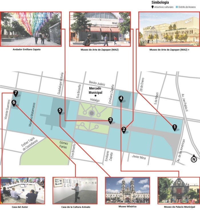 Autoridades municipales anunciaron el Distrito de Museos de Zapopan (Dimuz), el cual involucra una oferta cultural en un perímetro de más de 10 mil metros cuadrados en el Centro Histórico.Tres de sus siete atractivos principales ya operan: el Museo de Arte de Zapopan (MAZ), la Basílica y el Museo Wixárica, así como el Andador Emiliano Zapata.Los otros cuatro serán remodelados y tendrán nuevas construcciones: la plaza de Los Arcos, que incluye la eventual extensión del MAZ, la Presidencia Municipal (que se convertirá en museo), la Casa de la Cultura Arévalo y la Casa de Autor.El alcalde con licencia, Pablo Lemus Navarro, destacó que el proyecto impulsará la transformación de la ciudad, con base en la cultura y el arte urbano. “Este país necesita volver a sus orígenes, no a través de más policías y cámaras de vigilancia, necesitamos recuperar nuestra identidad a través de la educación, el civismo, la cultura y el arte. Que viva Zapopan, Guadalajara y Jalisco como la capital de México en la educación, cultura y arte”.Acentuó que se debe pensar en grande y no conformarse con poco. Y puso de ejemplo otros proyectos culturales, como la terminación de la construcción del Centro Cultural de “La Consti”, la edificación de las Colmenas o el impulso de las bibliotecas llamadas “Luciérnagas”.Juan José Frangie, presidente municipal electo, consideró que el Distrito de Museos atraerá más visitantes y detonará la reactivación económica.“Es una oportunidad grandísima para que todas y todos seamos más sensibles, y entender el mundo en el que vivimos”.Graciela de Obaldía, alcaldesa interina, dijo que se trata de uno de los proyectos más ambiciosos. “Hablar de cultura es hablar de su gente, lugares e historia. Somos un municipio muy rico en tradiciones y costumbres”.Con el Distrito de Museos, el Centro Histórico de Zapopan contará con más de 10 mil metros cuadrados de espacios dedicados a la actividad cultural, entre nuevos recintos, galerías y espacios para exhibiciones al aire libre. Esto se traduce en un polígono de siete cuadras, el cual inicia desde los Arcos (en el ingreso a la cabecera municipal), hasta la cuadra posterior a la Basílica, donde se encuentra la Casa de la Cultura Arévalo y la futura Casa del Autor.Tan sólo el actual Palacio Municipal, que se convertirá en museo, tiene una superficie de dos mil 400 metros cuadrados, y la extensión del Museo de Arte de Zapopan (MAZ) contará con cuatro mil 200 metros cuadrados, entre áreas cubiertas y al aire libre.Además del Andador Emiliano Zapata y el Museo Wixárica, que actualmente está anexo a la Basílica.Josefina Barragán Álvarez, directora de Turismo y Centro Histórico de Zapopan, remarca que uno de los ejes principales del Gobierno municipal es el fomento a la cultura.“Nos dimos cuenta que tenemos un polígono cultural enorme, con 10 mil metros de espacios para la proyección y fomento de la cultura, para ofrecerlo al turismo local, regional, nacional y extranjero. Las grandes ciudades tienen una oferta turística cultural importantísima. Vas a París y vas a los museos; en Nueva York o Chicago, uno de los grandes brazos del turismo es la cultura”.Subraya que este proyecto detonará un aumento de los visitantes, lo cual contribuirá en mejorar la economía.Desde que la Línea 3 del Tren Ligero comenzó operaciones, indica, hay más turistas en el Centro. “Es muy representativo, sobre todo en la zona gastronómica del Andador 20 de Noviembre, donde nuestra dirección realiza eventos gastronómicos y culturales. La Línea 3 marca la llegada de muchos visitantes”.Conformado por un polígono de siete cuadras. Iniciará en Los Arcos, hasta la cuadra posterior a la Basílica.1) Museo de Arte de Zapopan (MAZ) +Debido al éxito del espacio, se considera que el Museo de Arte de Zapopan (MAZ) + podría tener una extensión en la plaza que se construye aledaña a Los Arcos.La directora de Turismo remarca que actualmente el MAZ es pequeño comparado con lo que se puede lograr; incluso, para que pueda tener una colección propia. “Es muy probable que este museo que se va a construir en la Plaza Los Arcos sea una extensión del MAZ o que verdaderamente el MAZ se mude para allá. Tenemos que hacer una evaluación de todo”.2) Museo de Arte de Zapopan (MAZ)El museo actual está enfocado al arte contemporáneo y se tiene proyectado que así se mantenga. Próximamente se lanzará el Patronato del MAZ y serán sus integrantes quienes decidirán lo que sucederá con este espacio. El lugar está ubicado en el Centro Histórico (a un costado de la Basílica) y depende del Ayuntamiento. Fue inaugurado en el 2002. Su misión es generar experiencias que animen a la reflexión y al aprendizaje a través del arte contemporáneo, además de favorecer el diálogo entre lo establecido y las nuevas ideas que propicien conocimiento complejo y pensamiento propio.3) Andador Emiliano ZapataJosefina Barragán Álvarez recuerda que la calle Emiliano Zapata se hizo peatonal, entre Juárez e Hidalgo, y quedó un espacio que integra el jardín lateral de la Presidencia Municipal con el atrio del Templo de San Pedro. Dice que tras la remodelación se volvió “un espacio muy socorrido por la gente, pero se le dejó una explanada usada como galería urbana, igual que el espacio que está en la estación de la Línea 3 de Zapopan Centro, que también está enfocado para este tipo de exhibiciones. Hemos tenido tres o cuatro exposiciones en este espacio, que han sido todo un éxito”. 4) Museo de Palacio MunicipalEl Palacio o la Presidencia Municipal se convertirá en un museo, ya que la mayoría de las oficinas se trasladarán al Centro Integral de Servicios. Sólo conservará el Despacho del presidente, la Sala de ex presidentes y el Salón de sesiones.Sobre la vocación del espacio, se aplicarán mesas de trabajo con especialistas. “Podríamos lanzar un museo de arte sacro, de artes populares o