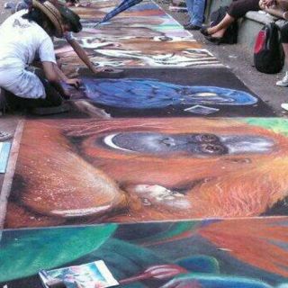 GUADALAJARA, JALISCO (10/MAR/2014).- La explanada principal del Zoológico de Guadalajara se llenó de color con la celebración del Festival de Arte sobre piso, "Animales de Colores" en el que participaron alrededor de cien personas entre jóvenes, adultos y niños dándole vida a los dibujos.
