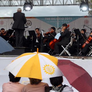 GUADALAJARA, JALISCO (04/SEP/2011).- La ceremonia inaugural de The Big Read 2011, en la Plaza Bicentenario, a un costado de la nueva Biblioteca Pública del Estado de Jalisco, Juan José Arreola, se vio opacada ayer en su inicio. Todavía a las 18:20 horas los músicos de la Orquesta Juvenil de Zapopan seguían afinando sus instrumentos. Los invitados especiales iban llegando y tomaban su asientos, los de ellos estaban secos, los del público en general permanecían con las gotas de agua acumulada de la lluvia.