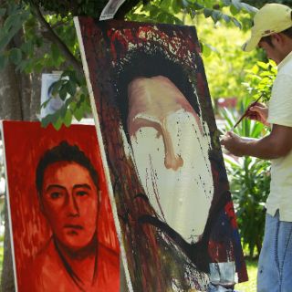Artistas pintan rostros de normalistas desaparecidos