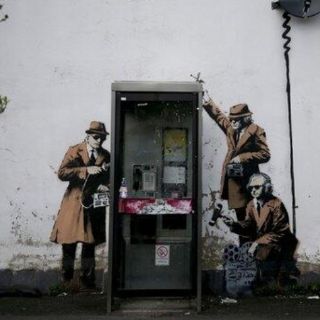 En este caso, el mural muestra a tres hombres vestidos con gabardinas y sombreros, el típico perfil del espía de los pasados años cincuenta, junto a una cabina de la compañía de telecomunicaciones BT y portando unos cables con los que intentan escuchar una conversación telefónica.
