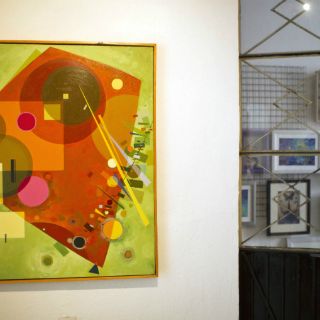 Al fondo de la casa antigua con domicilio en la avenida México no. 2160, ya están montadas las siete pinturas de medianos y grandes formatos hechas por Enrique Hool, un pintor autodidacta nacido en Guadalajara en 1978, con una marcada influencia de la obra de Kandinsky. “Su fuerte es un abstracto regido por la geometría y por las combinaciones de colores muy armónicas”, cuenta Laura Zohn, “pero también es un abstracto con mucha simbología”.