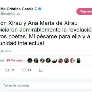 En un segundo tuit, García Cepeda dijo: "Ramón Xirau y Ana María de Xirau auspiciaron admirablemente la revelación de nuevos poetas. Mi pésame para ella y a la comunidad intelectual".