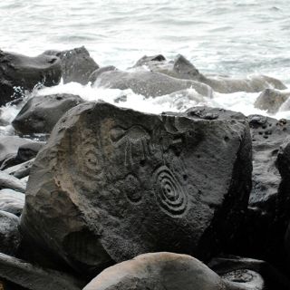 Hallado sobre la línea de playa y a menudo bañado por el mar, destaca un agrupamiento de rocas volcánicas —distribuidas en un área de 340 metros de longitud— sobre las que fueron tallados aproximadamente 640 grabados, algunos de los cuales incluso podrían datar del periodo Arcaico y tener al menos 4 mil años de antigüedad.