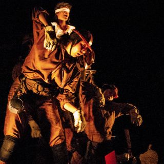 En escena los actores portan uniformes de mineros y son ellos los que realizan un trabajo físico para manipular los títeres