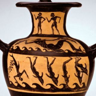Se trata de un kalpis, una vasija de cerámica utilizada en la antigüedad para guardar agua, que está decorada con la representación de una escena mitológica en la que los piratas están siendo transformados en delfines por Dionisio (dios del vino).