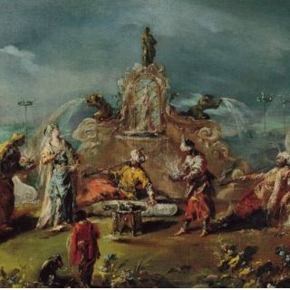 "La Escena en el jardín de un serrallo" (1743) de Antonio Guardi, perteneciente a la serie del artista dedicada a escenas de la corte de Constantinopla, es ejemplo de esta tendencia.