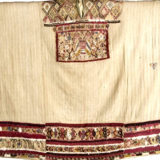 Se trata de una prenda de algodón y plumas, hecha en telar de cintura