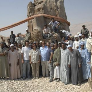 Una vez que se localizó el sitio exacto donde se encontraba la base de la estatua y se puso el soporte adecuado, llegó el momento de recolocar el coloso, una labor en la que participaron hasta trescientos obreros, quienes emplearon poleas "al más puro estilo faraónico", según López.