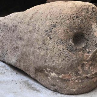 Explicó que tres de las cinco esculturas son solo fragmentos, entre las que destaca un clavo arquitectónico en forma de cráneo, el más grande encontrado hasta ahora en las inmediaciones del recinto prehispánico, de 88 centímetros de largo por 40 de ancho.
