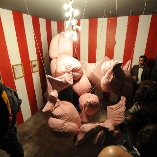 También en alusión a los expendios para comprar carne, las paredes fueron pintadas con líneas verticales blancas y rojas: “Casi siempre me gusta trabajar entre dos cosas, en esta ocasión entre El Principito y una carnicería, porque es de ahí de donde sacas las entrañas”, dijo.