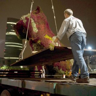 Tras llegar a Bilbao, las esculturas se descargaron en la explanada del museo, donde se ubica la popular escultura del perro "Poopy", de Jeff Koons.